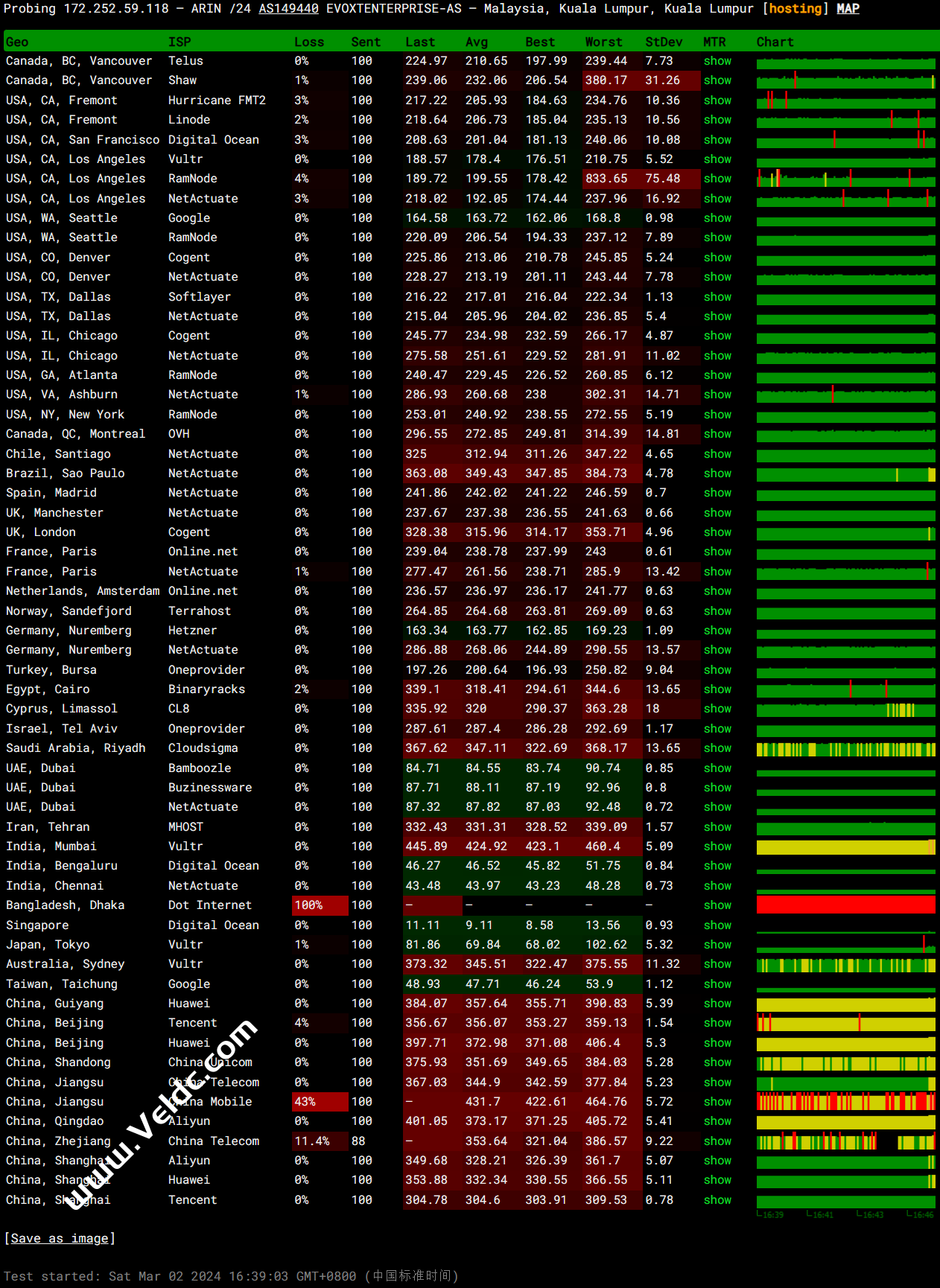 7 202.97.72.101 338.91 ms AS4134 China, Guangdong, Guangzhou, ChinaTelecom 8 * 9 * 10 * 11 113.108.209.1 352.08 ms AS58466 China, Guangdong, Guangzhou, ChinaTelecom Traceroute to China, Shanghai CT (TCP Mode, Max 30 Hop) ============================================================ traceroute to 180.153.28.5 (180.153.28.5), 30 hops max, 32 byte packets 1 172.252.59.1 0.29 ms AS149440 Malaysia, Kuala Lumpur, egihosting.com 2 * 3 * 4 * 5 * 6 64.62.244.62 179.65 ms AS6939 United States, California, Los Angeles, he.net 7 * 8 * 9 * 10 * 11 124.74.166.230 307.84 ms AS4812 China, Shanghai, ChinaTelecom 12 124.74.232.66 363.12 ms AS4812 China, Shanghai, ChinaTelecom 13 * 14 * 15 * 16 * 17 * 18 * 19 * 20 * 21 * 22 * 23 * 24 * 25 * 26 * 27 * 28 * 29 * 30 * Traceroute to China, Beijing CT (TCP Mode, Max 30 Hop) ============================================================ traceroute to 180.149.128.9 (180.149.128.9), 30 hops max, 32 byte packets 1 172.252.59.1 0.46 ms AS149440 Malaysia, Kuala Lumpur, egihosting.com 2 * 3 * 4 * 5 * 6 218.30.53.225 238.65 ms AS4134 United States, ChinaTelecom 7 202.97.41.105 347.17 ms AS4134 China, Beijing, ChinaTelecom 8 202.97.54.33 342.32 ms AS4134 China, Beijing, ChinaTelecom 9 * 10 * 11 * 12 * 13 * 14 * 15 * 16 * 17 * 18 * 19 * 20 * 21 * 22 * 23 * 24 * 25 * 26 * 27 * 28 * 29 * 30 * Traceroute to China, Guangzhou CU (TCP Mode, Max 30 Hop) ============================================================ traceroute to 210.21.4.130 (210.21.4.130), 30 hops max, 32 byte packets 1 172.252.59.1 0.36 ms AS149440 Malaysia, Kuala Lumpur, egihosting.com 2 * 3 * 4 * 5 * 6 216.218.207.31 351.24 ms AS6939 United States, California, Los Angeles, he.net 7 219.158.96.25 353.65 ms AS4837 China, Beijing, ChinaUnicom 8 219.158.3.145 337.36 ms AS4837 China, Beijing, ChinaUnicom 9 * 10 * 11 120.86.0.182 358.93 ms AS17816 China, Guangdong, Guangzhou, ChinaUnicom 12 120.80.169.118 368.33 ms AS17622 China, Guangdong, Guangzhou, ChinaUnicom 13 * 14 * 15 * 16 * 17 * 18 * 19 * 20 * 21 * 22 * 23 * 24 * 25 * 26 * 27 * 28 * 29 * 30 * Traceroute to China, Shanghai CU (TCP Mode, Max 30 Hop) ============================================================ traceroute to 58.247.8.158 (58.247.8.158), 30 hops max, 32 byte packets 1 172.252.59.1 0.39 ms AS149440 Malaysia, Kuala Lumpur, egihosting.com 2 184.104.219.160 3.00 ms AS6939 Malaysia, Kuala Lumpur, he.net 3 * 4 * 5 * 6 72.52.93.38 177.18 ms AS6939 United States, California, Los Angeles, he.net 7 219.158.4.9 367.85 ms AS4837 China, Beijing, ChinaUnicom 8 219.158.3.133 371.09 ms AS4837 China, Beijing, ChinaUnicom 9 * 10 * 11 * 12 112.64.250.202 349.53 ms AS17621 China, Shanghai, ChinaUnicom 13 58.247.8.153 364.92 ms AS17621 China, Shanghai, ChinaUnicom 14 * 15 * 16 * 17 * 18 * 19 * 20 * 21 * 22 * 23 * 24 * 25 * 26 * 27 * 28 * 29 * 30 * Traceroute to China, Beijing CU (TCP Mode, Max 30 Hop) ============================================================ traceroute to 123.125.99.1 (123.125.99.1), 30 hops max, 32 byte packets 1 172.252.59.1 0.33 ms AS149440 Malaysia, Kuala Lumpur, egihosting.com 2 184.104.219.160 1.47 ms AS6939 Malaysia, Kuala Lumpur, he.net 3 * 4 * 5 * 6 216.218.207.31 353.93 ms AS6939 United States, California, Los Angeles, he.net 7 219.158.4.9 355.00 ms AS4837 China, Beijing, ChinaUnicom 8 219.158.3.213 342.51 ms AS4837 China, Guangdong, Guangzhou, ChinaUnicom 9 * 10 * 11 * 12 219.232.11.202 409.98 ms AS4808 China, Beijing, ChinaUnicom 13 61.135.113.154 365.57 ms AS4808 China, Beijing, ChinaUnicom 14 123.125.99.1 349.23 ms AS4808 China, Beijing, ChinaUnicom Traceroute to China, Guangzhou CM (TCP Mode, Max 30 Hop) ============================================================ traceroute to 120.196.212.25 (120.196.212.25), 30 hops max, 32 byte packets 1 172.252.59.1 0.83 ms AS149440 Malaysia, Kuala Lumpur, egihosting.com 2 * 3 * 4 * 5 * 6 * 7 195.42.145.161 251.80 ms * France, Ile-de-France, Paris, equinix.com 8 223.120.10.109 251.09 ms AS58453 Germany, Hesse, Frankfurt, ChinaMobile 9 223.120.15.46 476.32 ms AS58453 China, Guangdong, Guangzhou, ChinaMobile 10 221.183.55.58 350.52 ms AS9808 China, Guangdong, Guangzhou, ChinaMobile 11 221.183.92.21 350.25 ms AS9808 China, Guangdong, Guangzhou, ChinaMobile 12 221.183.89.246 351.57 ms AS9808 China, Guangdong, Guangzhou, ChinaMobile 13 * 14 183.235.232.29 525.74 ms AS56040 China, Guangdong, Guangzhou, ChinaMobile 15 211.136.214.138 355.69 ms AS56040 China, Guangdong, Guangzhou, ChinaMobile 16 * 17 120.197.234.140 355.98 ms AS56040 China, Guangdong, Guangzhou, ChinaMobile 18 * 19 * 20 120.196.212.25 497.54 ms AS56040 China, Guangdong, Guangzhou, ChinaMobile Traceroute to China, Shanghai CM (TCP Mode, Max 30 Hop) ============================================================ traceroute to 221.183.55.22 (221.183.55.22), 30 hops max, 32 byte packets 1 172.252.59.1 0.13 ms AS149440 Malaysia, Kuala Lumpur, egihosting.com 2 * 3 * 4 184.105.222.9 149.36 ms AS6939 France, Provence-Alpes-Cote d'Azur, Marseille, he.net 5 * 6 * 7 195.42.145.161 240.44 ms * France, Ile-de-France, Paris, equinix.com 8 223.120.10.113 251.57 ms AS58453 Germany, Hesse, Frankfurt, ChinaMobile 9 223.120.15.10 437.21 ms AS58453 China, Beijing, ChinaMobile 10 221.183.55.102 438.07 ms AS9808 China, Beijing, ChinaMobile 11 * 12 * 13 * 14 * 15 * 16 * 17 * 18 * 19 * 20 * 21 * 22 * 23 * 24 * 25 * 26 * 27 * 28 * 29 * 30 * Traceroute to China, Beijing CM (TCP Mode, Max 30 Hop) ============================================================ traceroute to 211.136.25.153 (211.136.25.153), 30 hops max, 32 byte packets 1 172.252.59.1 0.14 ms AS149440 Malaysia, Kuala Lumpur, egihosting.com 2 * 3 * 4 * 5 * 6 * 7 62.115.181.193 178.69 ms AS1299 United States, California, Los Angeles, telia.com 8 62.115.171.219 181.21 ms AS1299 United States, California, Los Angeles, telia.com 9 223.120.6.22 181.49 ms AS58453 United States, California, Los Angeles, ChinaMobile 10 223.120.12.214 471.72 ms AS58453 China, Shanghai, ChinaMobile 11 221.183.55.106 416.77 ms AS9808 