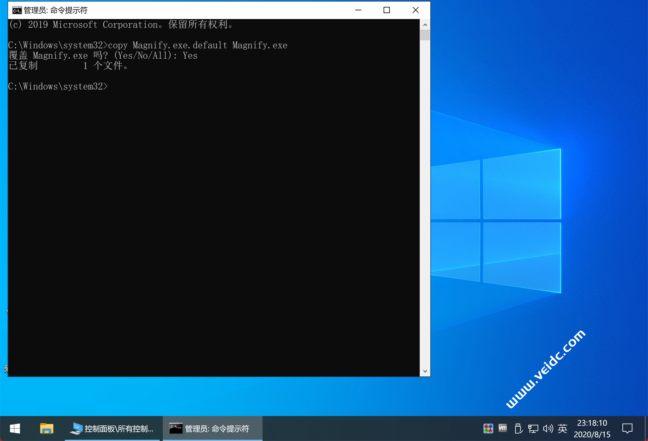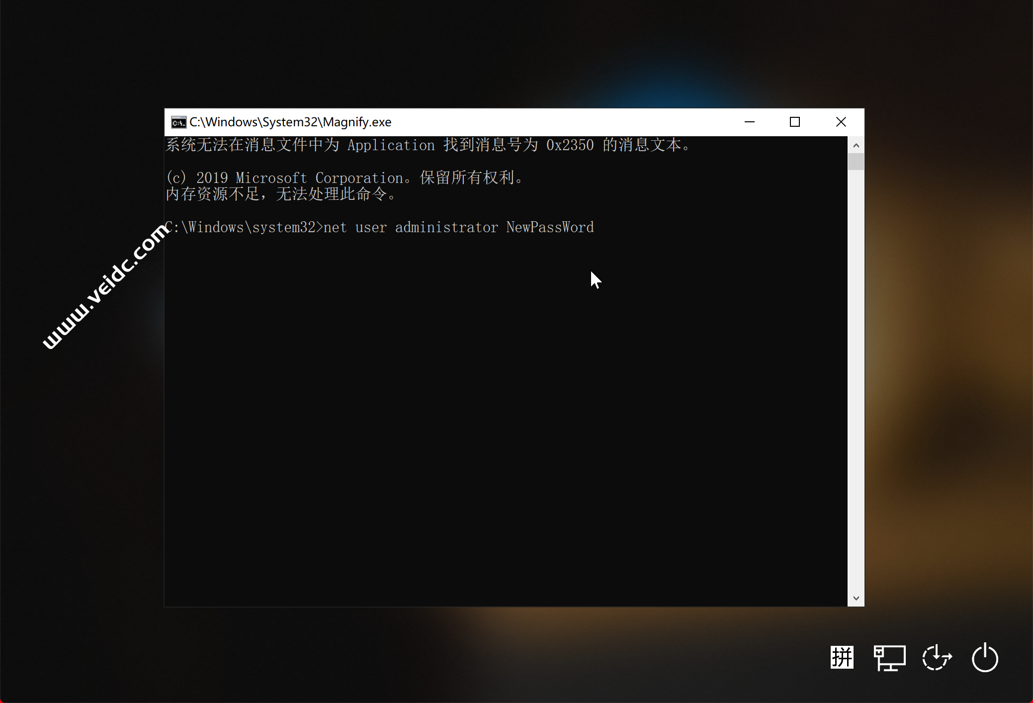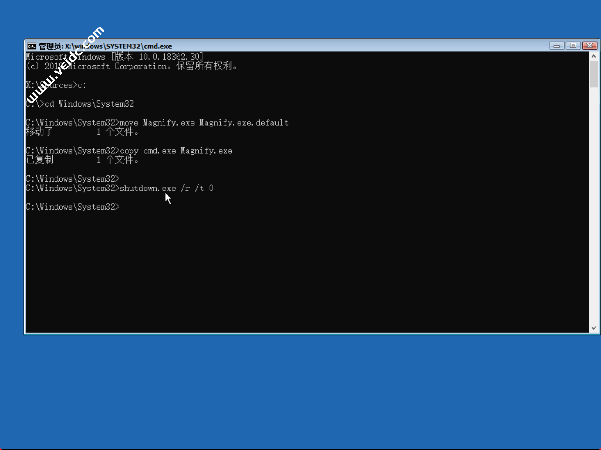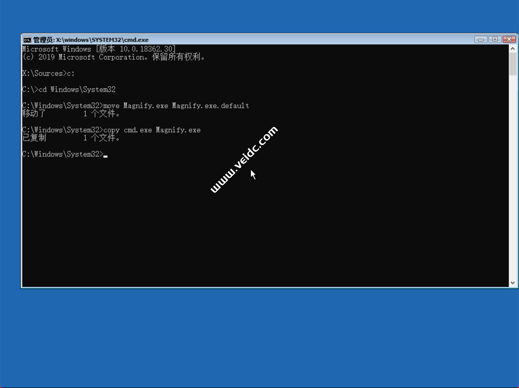 X:\Sources>c: "进入系统盘符" C:\>cd Windows\System32 "进入对应目录" C:\Windows\System32>move Magnify.exe Magnify.exe.default "备份放大镜文件" C:\Windows\System32>copy cmd.exe Magnify.exe "将cmd命令行换成放大镜"
