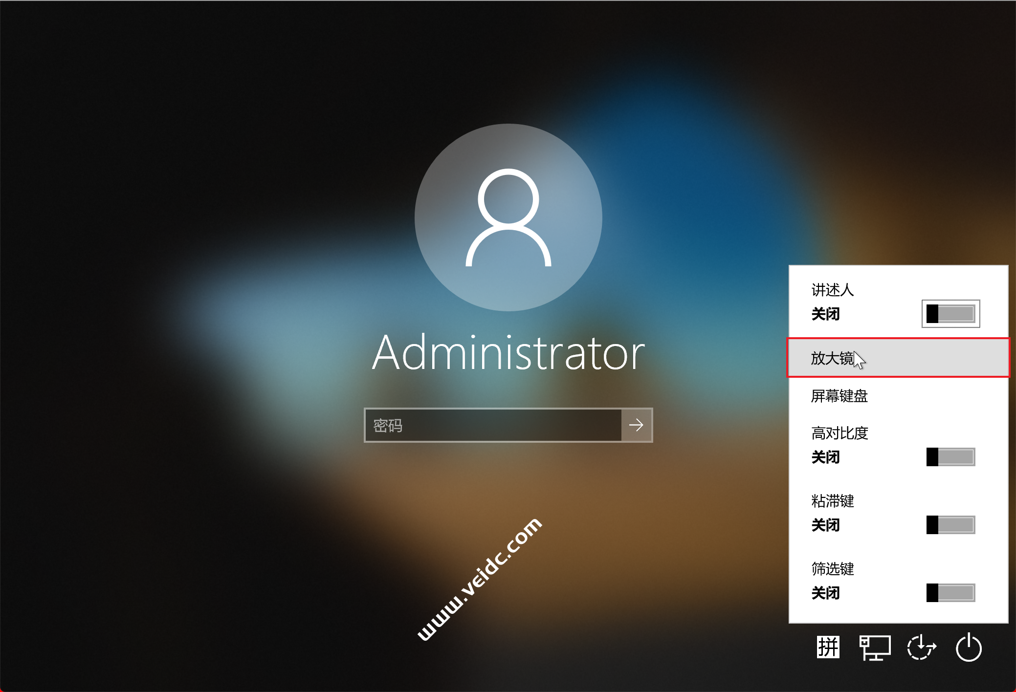 2、系统启动后进入系统登录界面;从左下角的按钮中找到**“放大镜”**