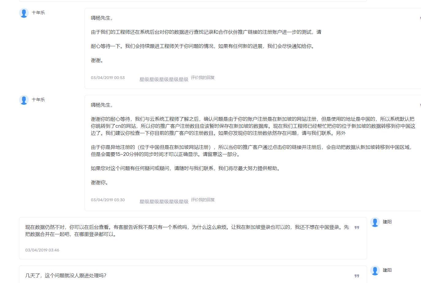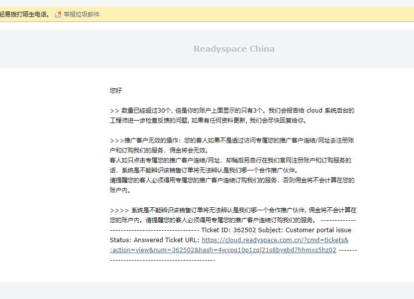 事件是这样的:我在Readyspace新加坡注册了账户并开通测试了新加坡云主机,于是注册推荐系统发文推荐,毕竟是免费的,还是可以试一下。但后面的事情发展超出我的想象。发文后推荐数量很快超过80+,注册开通数量也直线上升,群里的小伙伴反馈数量来看最少也是开通了30+。我没事就登录控制台(新加坡)去查看一下,结果大吃一惊,不能登录了。我看链接把我定位到了中国官网,登录提示密码不对,那么我注册吧(提示此邮箱已存在数据库),那我就重置密码,终于成功登录,一看推荐80+,开通注册数量只有3个。于是,我提交工单:询问Readyspace我的推荐注册数量不正确。先是有客服告诉我,因为我注册在新加坡,现在定位到中国,推荐在新加坡已有30+,并且让技术人员将数据给我合并在一起即可。直接上图吧,这样啰嗦挺累的。