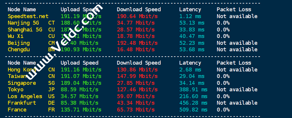 ============================================================ traceroute to 113.108.209.1 (113.108.209.1), 30 hops max, 32 byte packets 1 10.0.18.1 0.29 ms * LAN Address 2 * 3 * 4 * 5 223.120.3.85 2.61 ms AS58453 China, Hong Kong, ChinaMobile 6 223.120.3.198 27.88 ms AS58453 China, Shanghai, ChinaMobile 7 * 8 * 9 * 10 * 11 * 12 * 13 * 14 113.96.4.222 39.69 ms AS58466 China, Guangdong, Guangzhou, ChinaTelecom 15 113.108.209.1 36.92 ms AS58466 China, Guangdong, Guangzhou, ChinaTelecom Traceroute to China, Shanghai CT (TCP Mode, Max 30 Hop) ============================================================ traceroute to 180.153.28.5 (180.153.28.5), 30 hops max, 32 byte packets 1 10.0.18.1 0.23 ms * LAN Address 2 * 3 * 4 * 5 223.120.3.85 2.56 ms AS58453 China, Hong Kong, ChinaMobile 6 223.120.22.114 27.50 ms AS58453 China, Shanghai, ChinaMobile 7 * 8 * 9 * 10 * 11 * 12 * 13 * 14 101.95.207.234 34.09 ms AS4812 China, Shanghai, ChinaTelecom 15 124.74.232.58 39.14 ms AS4812 China, Shanghai, ChinaTelecom 16 * 17 * 18 * 19 * 20 * 21 * 22 * 23 * 24 * 25 * 26 * 27 * 28 * 29 * 30 * Traceroute to China, Beijing CT (TCP Mode, Max 30 Hop) ============================================================ traceroute to 180.149.128.9 (180.149.128.9), 30 hops max, 32 byte packets 1 10.0.18.1 0.21 ms * LAN Address 2 * 3 10.100.2.1 0.51 ms * LAN Address 4 * 5 223.120.3.85 2.73 ms AS58453 China, Hong Kong, ChinaMobile 6 * 7 * 8 * 9 * 10 * 11 * 12 * 13 * 14 * 15 36.110.251.61 57.67 ms AS23724 China, Beijing, ChinaTelecom 16 * 17 * 18 * 19 * 20 * 21 * 22 * 23 * 24 * 25 * 26 * 27 * 28 * 29 * 30 * Traceroute to China, Guangzhou CU (TCP Mode, Max 30 Hop) ============================================================ traceroute to 210.21.4.130 (210.21.4.130), 30 hops max, 32 byte packets 1 10.0.18.1 0.26 ms * LAN Address 2 * 3 * 4 * 5 223.120.3.85 2.60 ms AS58453 China, Hong Kong, ChinaMobile 6 223.120.3.202 29.23 ms AS58453 China, Shanghai, ChinaMobile 7 * 8 * 9 221.183.89.14 33.83 ms AS9808 China, Shanghai, ChinaMobile 10 * 11 * 12 219.158.46.149 43.41 ms AS4837 China, Guangdong, Guangzhou, ChinaUnicom 13 219.158.125.165 44.51 ms AS4837 China, Guangdong, Guangzhou, ChinaUnicom 14 * 15 120.80.170.254 38.89 ms AS17622 China, Guangdong, Guangzhou, ChinaUnicom 16 * 17 * 18 * 19 * 20 * 21 * 22 * 23 * 24 * 25 * 26 * 27 * 28 * 29 * 30 * Traceroute to China, Shanghai CU (TCP Mode, Max 30 Hop) ============================================================ traceroute to 58.247.8.158 (58.247.8.158), 30 hops max, 32 byte packets 1 10.0.18.1 0.29 ms * LAN Address 2 * 3 10.100.1.1 0.46 ms * LAN Address 4 * 5 * 6 * 7 * 8 * 9 * 10 221.183.90.254 34.05 ms AS9808 China, Shanghai, ChinaMobile 11 221.183.123.106 37.75 ms AS9808 China, Shanghai, ChinaMobile 12 * 13 * 14 * 15 58.247.8.153 46.20 ms AS17621 China, Shanghai, ChinaUnicom 16 * 17 * 18 * 19 * 20 * 21 * 22 * 23 * 24 * 25 * 26 * 27 * 28 * 29 * 30 * Traceroute to China, Beijing CU (TCP Mode, Max 30 Hop) ============================================================ traceroute to 123.125.99.1 (123.125.99.1), 30 hops max, 32 byte packets 1 10.0.18.1 0.37 ms * LAN Address 2 * 3 10.100.2.1 0.66 ms * LAN Address 4 * 5 223.120.3.85 2.10 ms AS58453 China, Hong Kong, ChinaMobile 6 223.120.22.118 27.42 ms AS58453 China, Shanghai, ChinaMobile 7 * 8 * 9 * 10 * 11 * 12 221.183.128.118 104.34 ms AS9808 China, Beijing, ChinaMobile 13 * 14 * 15 219.232.11.130 102.05 ms AS4808 China, Beijing, ChinaUnicom 16 61.135.113.154 101.54 ms AS4808 China, Beijing, ChinaUnicom 17 * 18 123.125.99.1 101.46 ms AS4808 China, Beijing, ChinaUnicom Traceroute to China, Guangzhou CM (TCP Mode, Max 30 Hop) ============================================================ traceroute to 120.196.212.25 (120.196.212.25), 30 hops max, 32 byte packets 1 10.0.18.1 0.27 ms * LAN Address 2 * 3 10.100.3.1 0.63 ms * LAN Address 4 * 5 223.120.3.85 2.60 ms AS58453 China, Hong Kong, ChinaMobile 6 223.120.2.86 14.33 ms AS58453 China, Guangdong, Guangzhou, ChinaMobile 7 * 8 221.183.92.21 9.76 ms AS9808 China, Guangdong, Guangzhou, ChinaMobile 9 * 10 * 11 211.136.204.109 14.07 ms AS56040 China, Guangdong, Guangzhou, ChinaMobile 12 211.136.203.18 13.43 ms AS56040 China, Guangdong, Guangzhou, ChinaMobile 13 211.139.180.106 11.78 ms AS56040 China, Guangdong, Guangzhou, ChinaMobile 14 211.139.180.110 16.18 ms AS56040 China, Guangdong, Guangzhou, ChinaMobile 15 120.197.234.140 9.64 ms AS56040 China, Guangdong, Guangzhou, ChinaMobile 16 120.196.212.25 10.70 ms AS56040 China, Guangdong, Guangzhou, ChinaMobile Traceroute to China, Shanghai CM (TCP Mode, Max 30 Hop) ============================================================ traceroute to 221.183.55.22 (221.183.55.22), 30 hops max, 32 byte packets 1 10.0.18.1 0.19 ms * LAN Address 2 * 3 10.100.2.1 0.53 ms * LAN Address 4 * 5 223.120.3.85 2.23 ms AS58453 China, Hong Kong, ChinaMobile 6 223.120.3.198 27.97 ms AS58453 China, Shanghai, ChinaMobile 7 221.183.55.82 9.44 ms AS9808 China, Guangdong, Guangzhou, ChinaMobile 8 * 9 * 10 * 11 * 12 * 13 * 14 * 15 * 16 * 17 * 18 * 19 * 20 * 21 * 22 * 23 * 24 * 25 * 26 * 27 * 28 * 29 * 30 * Traceroute to China, Beijing CM (TCP Mode, Max 30 Hop) ============================================================ traceroute to 211.136.25.153 (211.136.25.153), 30 hops max, 32 byte packets 1 10.0.18.1 0.18 ms * LAN Address 2 * 3 10.100.2.1 1.05 ms * LAN Address 4 * 5 223.120.3.85 2.56 ms AS58453 China, Hong Kong, ChinaMobile 6 223.120.22.142 39.36 ms AS58453 China, Beijing, ChinaMobile 7 221.183.55.106 41.47 ms AS9808 China, Beijing, ChinaMobile 8 221.183.25.201 42.78 ms AS9808 China, Beijing, ChinaMobile 9 221.183.89.98 48.75 ms AS9808 China, Beijing, ChinaMobile 10 * 11 * 12 211.136.63.66 52.01 ms AS56048 China, Beijing, ChinaMobile 13 211.136.95.226 51.27 ms AS56048 China, Beijing, ChinaMobile 14 * 15 * 16 * 17 211.136.25.153 50.78 ms AS56048 China, Beijing, ChinaMobile Traceroute to China, Beijing Dr.Peng Network IDC Network (TCP Mode, Max 30 Hop) ==================================