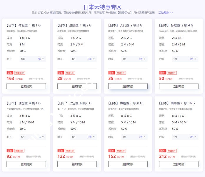| 日本云 | 1核1G | 50G(SSD) | 2M(CN2) | 12元/月 | 163元/年(原价816元) | 链接 |