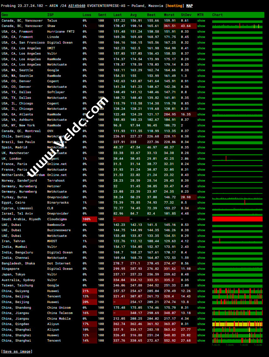 Traceroute to China, Guangzhou CT (TCP Mode, Max 30 Hop) ============================================================ traceroute to 113.108.209.1 (113.108.209.1), 30 hops max, 32 byte packets 1 23.27.24.1 0.70 ms AS149440 Poland, Masovian Voivodeship, Wyszkow, egihosting.com 2 10.255.254.1 1.70 ms * LAN Address 3 * 4 154.54.37.41 2.82 ms AS174 Poland, Masovian Voivodeship, Warsaw, cogentco.com 5 130.117.51.106 15.08 ms AS174 Germany, Hamburg, cogentco.com 6 154.54.58.229 23.48 ms AS174 Germany, Hesse, Frankfurt, cogentco.com 7 130.117.1.117 23.26 ms AS174 Germany, Hesse, Frankfurt, cogentco.com 8 149.14.159.114 193.24 ms AS174 Germany, Hesse, Frankfurt, cogentco.com 9 * 10 * 11 * 12 * 13 * 14 * 15 * 16 * 17 * 18 * 19 * 20 * 21 * 22 * 23 * 24 * 25 * 26 * 27 * 28 * 29 * 30 * Traceroute to China, Shanghai CT (TCP Mode, Max 30 Hop) ============================================================ traceroute to 180.153.28.5 (180.153.28.5), 30 hops max, 32 byte packets 1 23.27.24.1 0.23 ms AS149440 Poland, Masovian Voivodeship, Wyszkow, egihosting.com 2 10.255.254.1 1.81 ms * LAN Address 3 * 4 154.54.37.41 3.11 ms AS174 Poland, Masovian Voivodeship, Warsaw, cogentco.com 5 130.117.51.106 15.14 ms AS174 Germany, Hamburg, cogentco.com 6 154.54.58.229 23.44 ms AS174 Germany, Hesse, Frankfurt, cogentco.com 7 130.117.1.117 23.57 ms AS174 Germany, Hesse, Frankfurt, cogentco.com 8 149.14.159.114 73.97 ms AS174 Germany, Hesse, Frankfurt, cogentco.com 9 * 10 * 11 * 12 101.95.120.157 324.82 ms AS4812 China, Shanghai, ChinaTelecom 13 * 14 222.73.35.102 272.88 ms AS4812 China, Shanghai, ChinaTelecom 15 * 16 * 17 * 18 * 19 * 20 * 21 * 22 * 23 * 24 * 25 * 26 * 27 * 28 * 29 * 30 * Traceroute to China, Beijing CT (TCP Mode, Max 30 Hop) ============================================================ traceroute to 180.149.128.9 (180.149.128.9), 30 hops max, 32 byte packets 1 23.27.24.1 2.95 ms AS149440 Poland, Masovian Voivodeship, Wyszkow, egihosting.com 2 10.255.254.1 1.68 ms * LAN Address 3 * 4 154.54.37.41 20.88 ms AS174 Poland, Masovian Voivodeship, Warsaw, cogentco.com 5 130.117.51.62 14.91 ms AS174 Germany, Hamburg, cogentco.com 6 154.54.39.213 23.78 ms AS174 United Kingdom, London, cogentco.com 7 130.117.1.117 23.61 ms AS174 Germany, Hesse, Frankfurt, cogentco.com 8 149.14.159.114 75.01 ms AS174 Germany, Hesse, Frankfurt, cogentco.com 9 * 10 202.97.12.69 307.69 ms AS4134 China, Beijing, ChinaTelecom 11 * 12 * 13 * 14 * 15 * 16 * 17 * 18 * 19 * 20 * 21 * 22 * 23 * 24 * 25 * 26 * 27 * 28 * 29 * 30 * Traceroute to China, Guangzhou CU (TCP Mode, Max 30 Hop) ============================================================ traceroute to 210.21.4.130 (210.21.4.130), 30 hops max, 32 byte packets 1 23.27.24.1 0.21 ms AS149440 Poland, Masovian Voivodeship, Wyszkow, egihosting.com 2 10.255.254.1 1.89 ms * LAN Address 3 * 4 154.54.37.41 2.96 ms AS174 Poland, Masovian Voivodeship, Warsaw, cogentco.com 5 130.117.51.62 15.30 ms AS174 Germany, Hamburg, cogentco.com 6 154.54.39.213 23.79 ms AS174 United Kingdom, London, cogentco.com 7 154.54.37.30 32.64 ms AS174 Germany, Hesse, Frankfurt, cogentco.com 8 154.25.2.166 24.00 ms AS174 Germany, Hesse, Frankfurt, cogentco.com 9 149.11.84.186 21.71 ms AS174 Germany, Hesse, Frankfurt, cogentco.com 10 219.158.14.149 165.09 ms AS4837 China, Guangdong, Guangzhou, ChinaUnicom 11 219.158.4.105 172.66 ms AS4837 China, Guangdong, Guangzhou, ChinaUnicom 12 219.158.3.9 172.69 ms AS4837 China, Guangdong, Guangzhou, ChinaUnicom 13 112.96.0.2 162.73 ms AS17816 China, Guangdong, Guangzhou, ChinaUnicom 14 120.80.169.118 167.87 ms AS17622 China, Guangdong, Guangzhou, ChinaUnicom 15 * 16 * 17 * 18 * 19 * 20 * 21 * 22 * 23 * 24 * 25 * 26 * 27 * 28 * 29 * 30 * Traceroute to China, Shanghai CU (TCP Mode, Max 30 Hop) ============================================================ traceroute to 58.247.8.158 (58.247.8.158), 30 hops max, 32 byte packets 1 23.27.24.1 0.61 ms AS149440 Poland, Masovian Voivodeship, Wyszkow, egihosting.com 2 10.255.254.1 1.89 ms * LAN Address 3 * 4 154.54.37.41 2.63 ms AS174 Poland, Masovian Voivodeship, Warsaw, cogentco.com 5 130.117.51.62 15.20 ms AS174 Germany, Hamburg, cogentco.com 6 154.54.58.229 23.49 ms AS174 Germany, Hesse, Frankfurt, cogentco.com 7 154.54.37.30 23.85 ms AS174 Germany, Hesse, Frankfurt, cogentco.com 8 154.25.2.166 23.96 ms AS174 Germany, Hesse, Frankfurt, cogentco.com 9 149.14.211.170 23.48 ms AS174 Germany, Hesse, Frankfurt, cogentco.com 10 219.158.3.237 168.58 ms AS4837 China, Guangdong, Guangzhou, ChinaUnicom 11 219.158.4.49 179.36 ms AS4837 China, Guangdong, Guangzhou, ChinaUnicom 12 219.158.97.1 162.67 ms AS4837 China, Guangdong, Guangzhou, ChinaUnicom 13 * 14 * 15 * 16 58.247.8.153 199.55 ms AS17621 China, Shanghai, ChinaUnicom 17 * 18 * 19 * 20 * 21 * 22 * 23 * 24 * 25 * 26 * 27 * 28 * 29 * 30 * Traceroute to China, Beijing CU (TCP Mode, Max 30 Hop) ============================================================ traceroute to 123.125.99.1 (123.125.99.1), 30 hops max, 32 byte packets 1 23.27.24.1 0.25 ms AS149440 Poland, Masovian Voivodeship, Wyszkow, egihosting.com 2 10.255.254.1 1.66 ms * LAN Address 3 * 4 154.54.37.41 2.87 ms AS174 Poland, Masovian Voivodeship, Warsaw, cogentco.com 5 130.117.51.106 15.09 ms AS174 Germany, Hamburg, cogentco.com 6 154.54.58.229 23.55 ms AS174 Germany, Hesse, Frankfurt, cogentco.com 7 130.117.1.117 23.48 ms AS174 Germany, Hesse, Frankfurt, cogentco.com 8 * 9 219.158.13.141 168.12 ms AS4837 China, Beijing, ChinaUnicom 10 219.158.10.77 179.06 ms AS4837 China, Beijing, ChinaUnicom 11 * 12 * 13 61.148.158.90 175.26 ms AS4808 China, Beijing, ChinaUnicom 14 * 15 * 16 123.125.99.1 179.12 ms AS4808 China, Beijing, ChinaUnicom Traceroute to China, Guangzhou CM (TCP Mode, Max 30 Hop) ============================================================ traceroute to 120.196.212.25 (120.196.212.25), 30 hops max, 32 byte packets 1 23.27.24.1 0.32 ms AS149440 Poland, Masovian Voivodeship, Wyszkow, egihosting.com 2 10.255.254.1 1.86 ms * LAN Addres