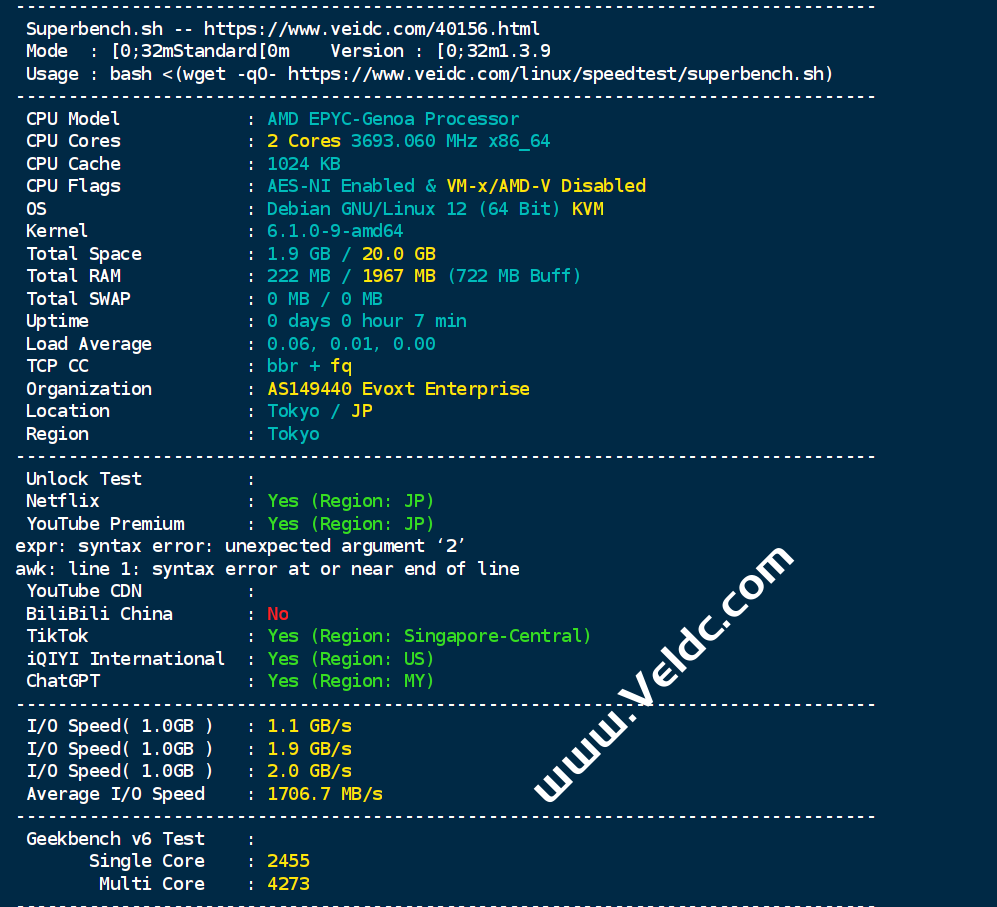 Evoxt近日相继新增了波兰华沙和日本东京机房,东京是日本第二个机房,非优质线路,国内网络一般,需要优质线路还是建议选择日本大阪软银线路VPS,日本东京机房支持Netflix、ChatGPT等各种应用,Tiktok解锁在美区,下面是Evoxt商家的日本东京VPS详细测评。