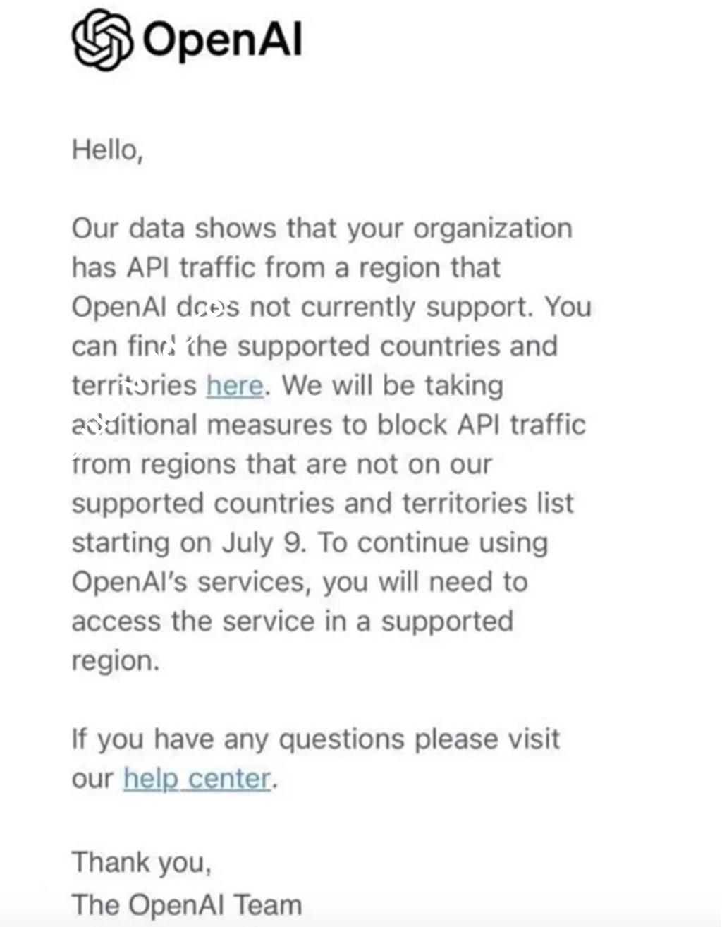 市场从24日晚间传出,多位大陆用户收到来自OpenAI的邮件,内容称“资料显示您的组织来自OpenAI目前不支援的地区的API流量”,并邮件进一步表示,“自7月9日起,OpenAI将开始阻止来自非支援国家和地区的API流量。受影响组织若希望继续使用OpenAI的服务,必须在其支援的国家或地区内访问”。对于高度依赖OpenAI的大陆创业公司,恐将迎来灭顶之灾。