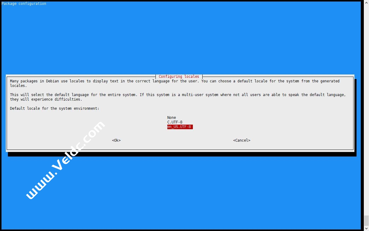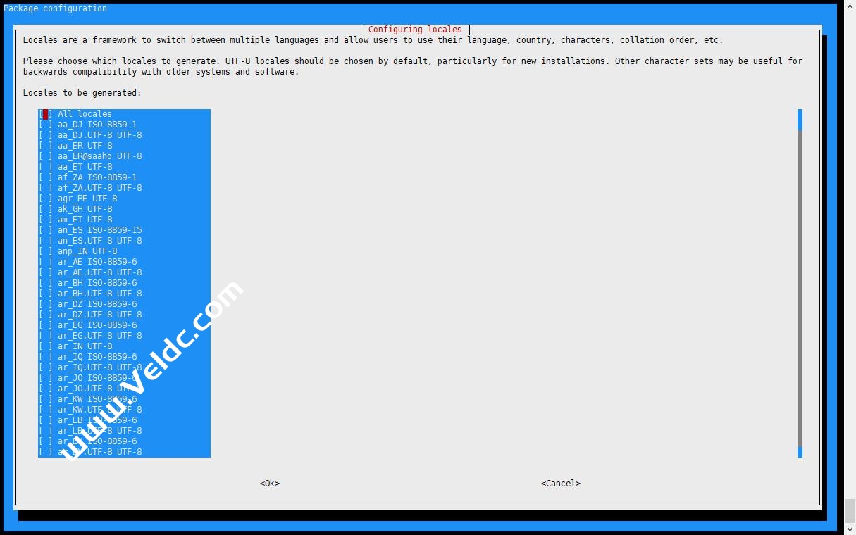 通过方向键与空格键选择 en_us.UF-8,其余全部取消,然后按Tab选择<OK>,回车进入下一个界面: