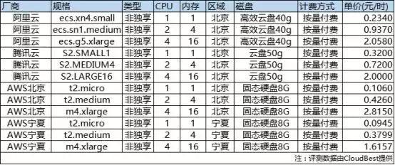 本次评测均采用非独享云主机默认配置,选取按量付费按小时计费原则,此处应说明的是阿里云、腾讯云云主机单价含带宽(1M)及存储费用,AWS不含带宽和存储费用。同时考虑到各家磁盘不同,性能测试主要涉及CPU指标,不包含磁盘部分。
