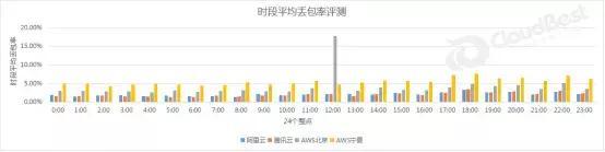 如上图显示的四个评测对象由0:00-23:00各个整点的平均时段丢包率数据情况,阿里云与腾讯云在丢包率上优于AWS北京、AWS宁夏;且在凌晨时段,腾讯云丢包率较多低于阿里云,在晚上时段,阿里云丢包率较多低于腾讯云;除了在正午12点AWS北京平均丢包率数据反差较大外,其他23个整点,AWS北京平均丢包率数据均小于AWS宁夏。