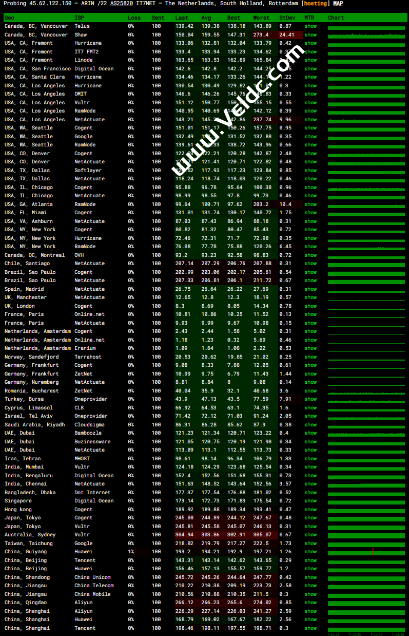 搬瓦工荷兰 EUNL_2 机房延迟测试结果如下,延迟表现比较一般,毕竟机房也比较远,而且线路也没有做特殊优化。