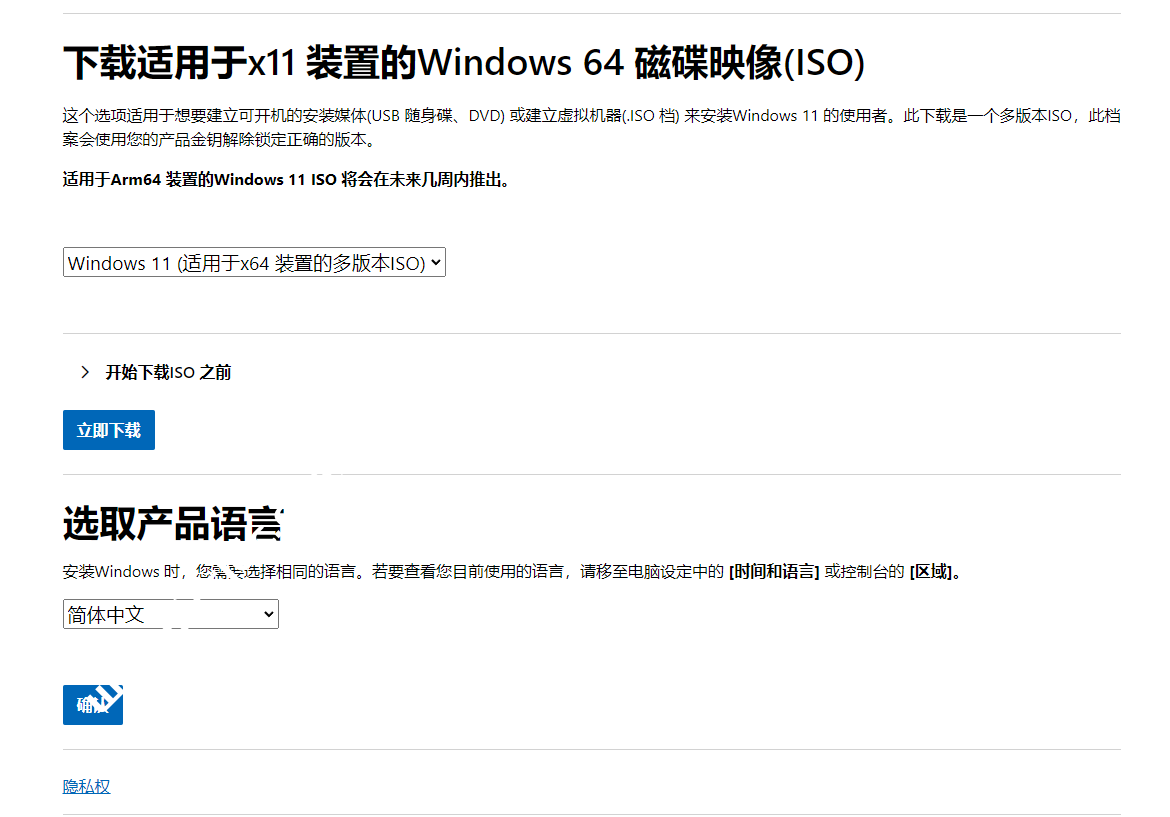 按此前往微软官网,找到「下载适用于x11 装置的Windows 64 磁碟映像」 (x11 有是可能打错),点选下方栏位「选择Windows 11 (适用于x64 装置的多版本ISO)」,接着按左下角的「立即下载」。