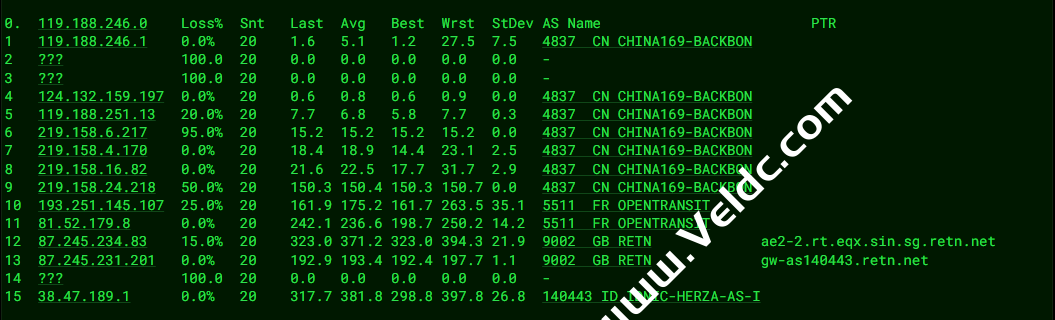 电信去程路由是从广州网口出去,绕道美国洛杉矶机房后,经过新加坡节点到达吉隆坡机房。