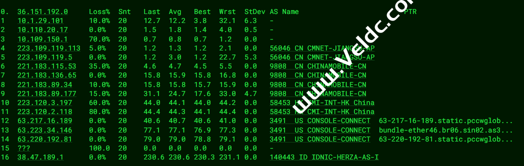 可以看到三网都是绕道了的,并且经过新加坡节点后才到达吉隆坡机房,因为都不是直连,所以三网延迟都比较高,相对来说移动网络还稍微好一点。