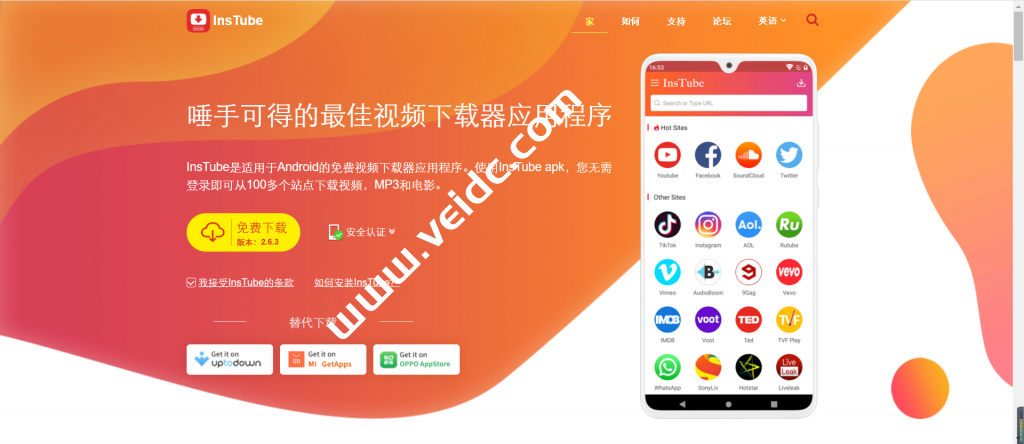 这个Android YouTube视频下载器应用程序支持从许多流行的在线视频托管网站(包括YouTube,SoundCloud,Twitter,Vevo等)下载视频和音乐。使用InsTube YouTube下载器下载高清YouTube视频。从YouTube和其他电影网站以多种分辨率下载4K视频:360p,720p,1080p等。