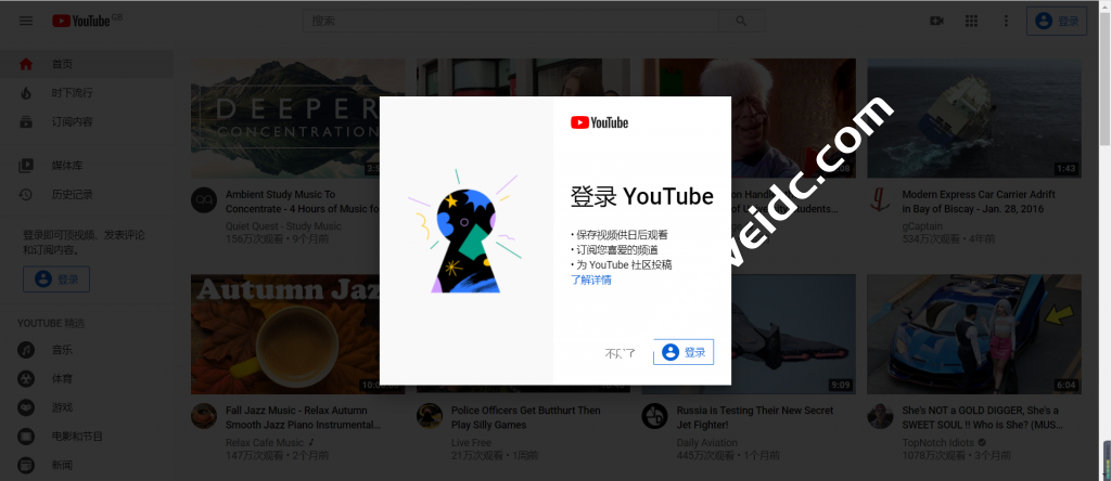 之后我们就可以进入网站注册了,点入链接进入官网:https://www.youtube.com/ 进入之后就会弹出登录界面,选择【登录】(如果没有弹出也没有关系,点击网页右上角可以选择登录)