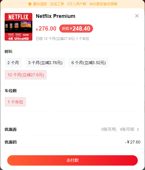 价格方面,奈飞小铺的优势简直不要太突出。以奈飞账号为例,官方的 4K Premium 会员账号,每月的订阅费用高达 17.99 美元,换算成人民币大概是 117 元左右,这对很多人来说,是一笔不小的开支。而在奈飞小铺,合租一个支持 4K 播放的奈飞账号,平均每月只需 22 元左右 。要是你一次性购买 12 个月,每月更是低至 20 元。算下来,一年就能节省一千多元,这省下来的钱,都够再去看几场电影,或者吃几顿大餐了。