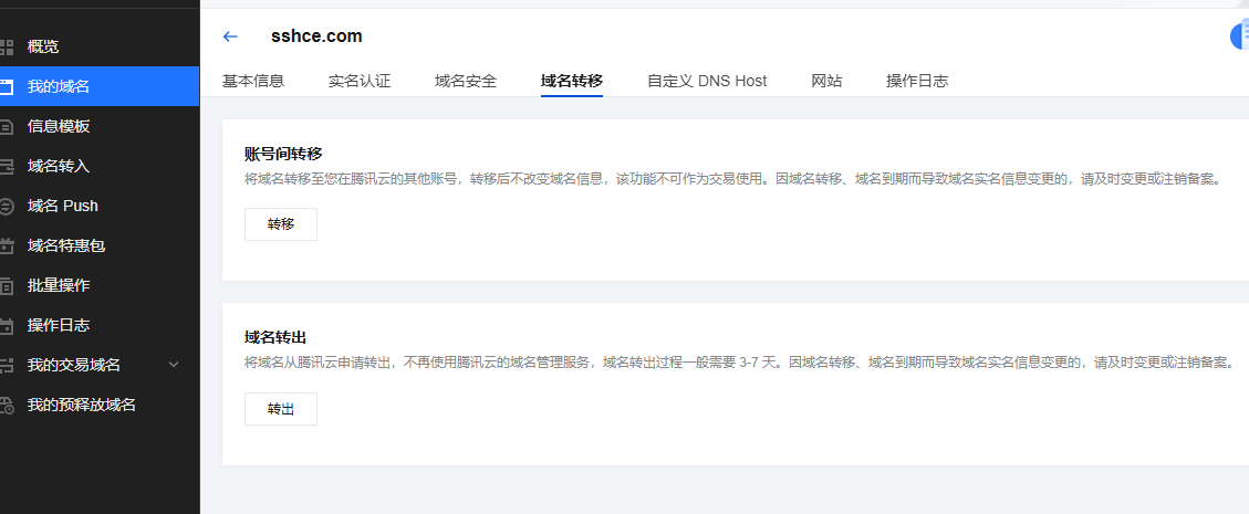 点击域名转出:将域名从腾讯云申请转出,不再使用腾讯云的域名管理服务,域名转出过程一般需要 3-7 天。因域名转移、域名到期而导致域名实名信息变更的,请及时变更或注销备案。