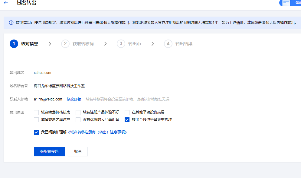 经过安全验证后,开始核对信息,腾讯云搞得很麻烦,其它国外注册商直接就给你转移密码了。
