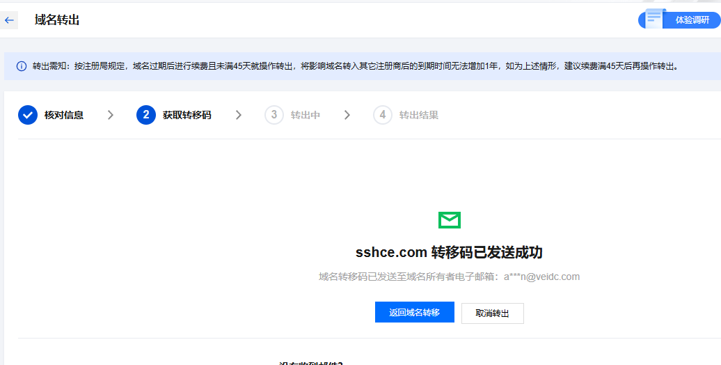 转移码会发送到邮箱: