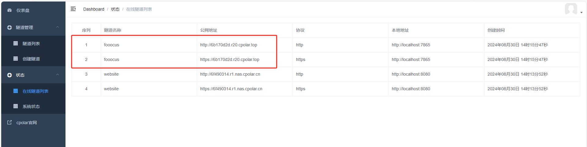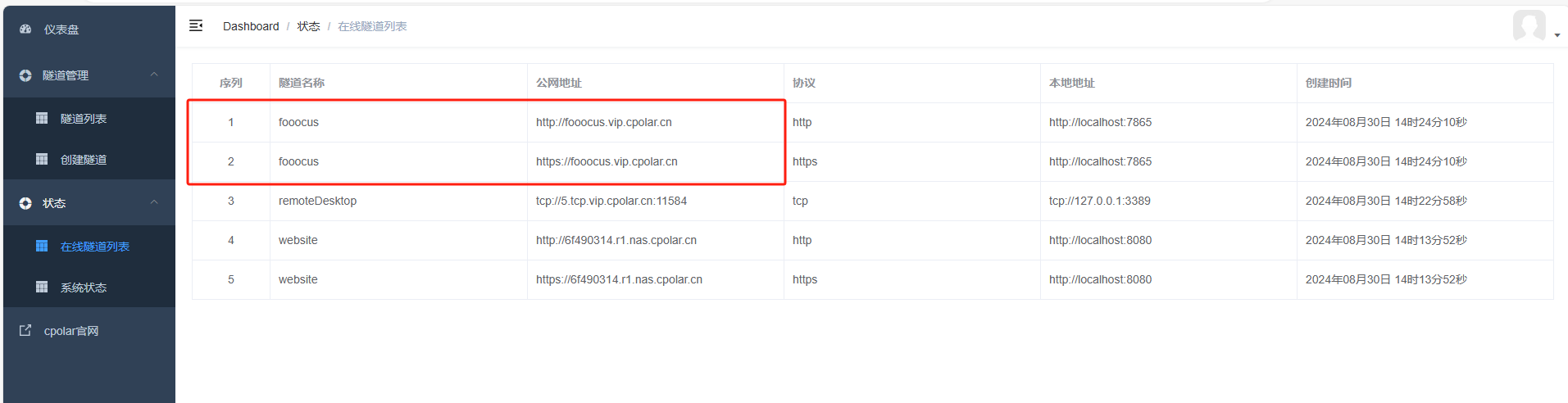 更新完成后,打开在线隧道列表,此时可以看到公网地址已经发生变化,地址名称也变成了固定的二级子域名名称的域名