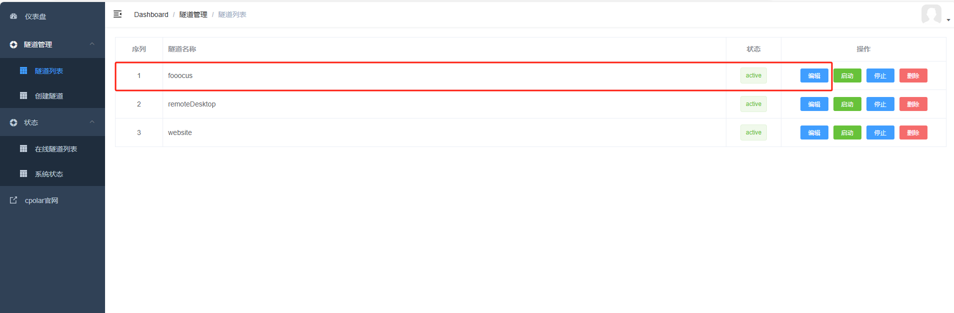返回登录Cpolar web UI管理界面,点击左侧仪表盘的隧道管理——隧道列表,找到所要配置的隧道,点击右侧的编辑