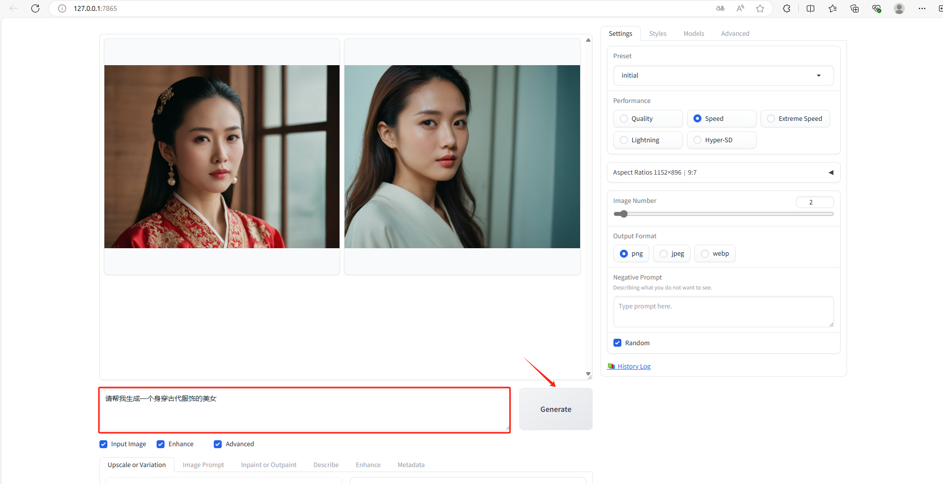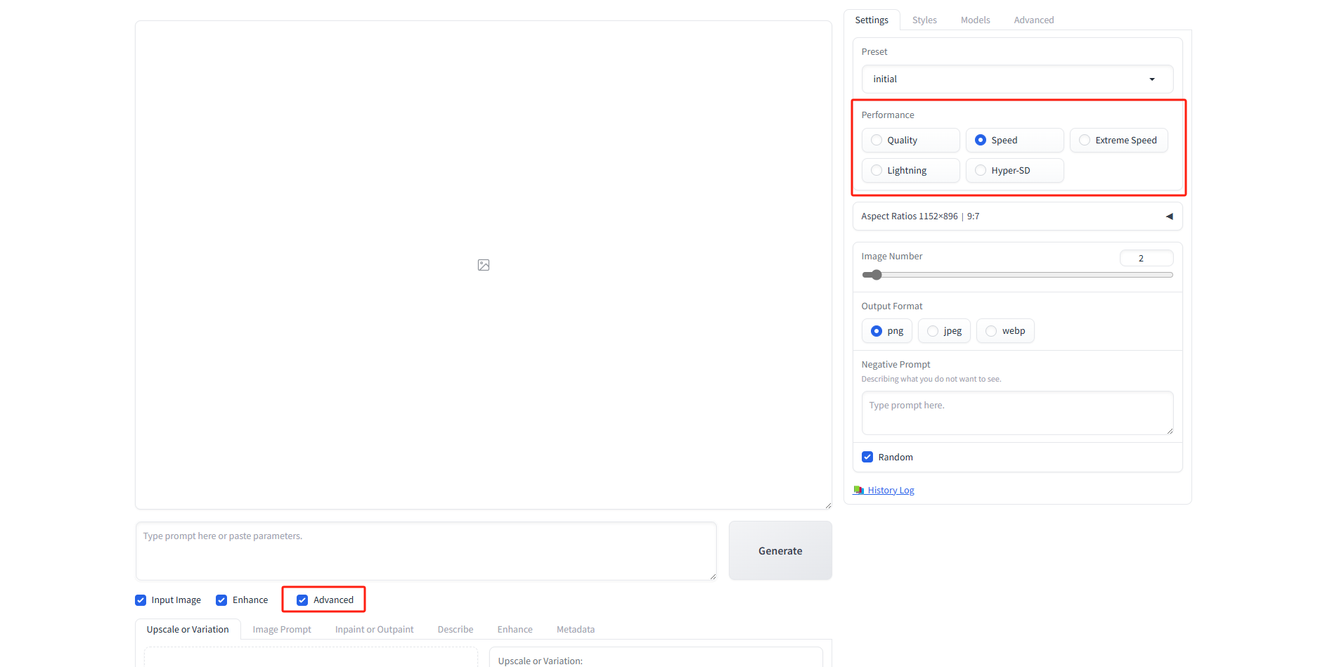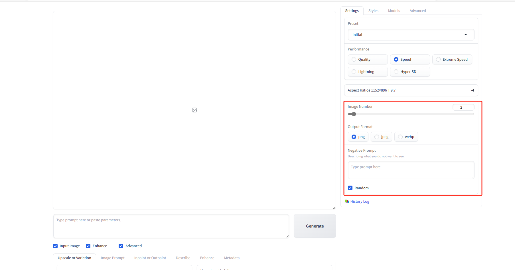 Image Number:生成图片数量 Negative Prompt:反提示词 Random:随机种子,可以固定种子数字,和Stable Diffusion是一样的