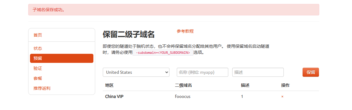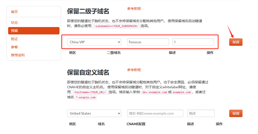 - Sub Domain:填写保留成功的二级子域名