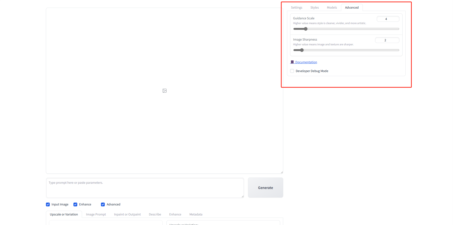 Guidance Scale:提示词引导系数 Image Sharpness:图像锐度 Developer Debug Mode:开发者调试模式