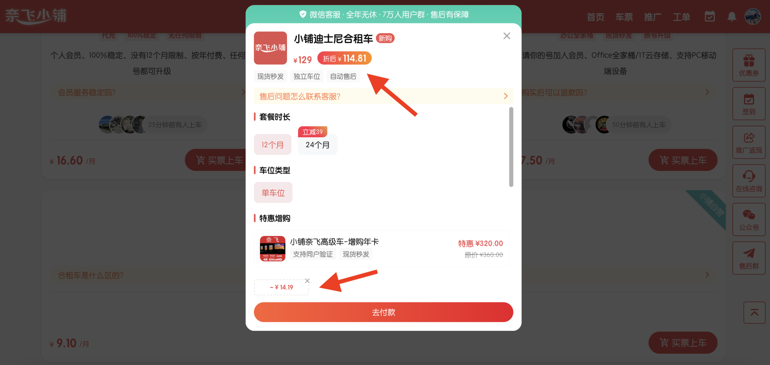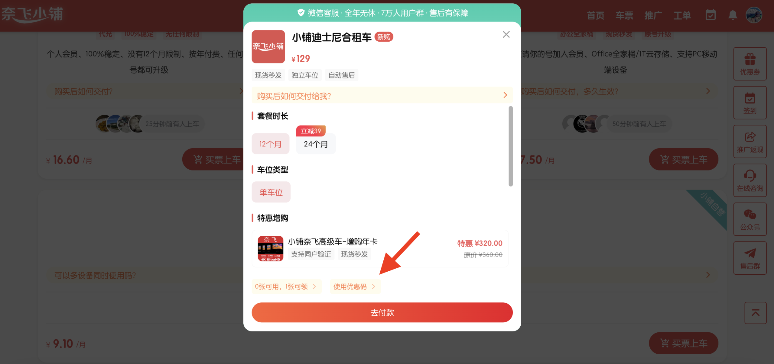 3、在小铺迪士尼合租车账号订单页面可以看到,订购页面简洁明了,用户可选择不同订购时长,享受价格优惠,同时支持独立车位,现货秒发等功能。