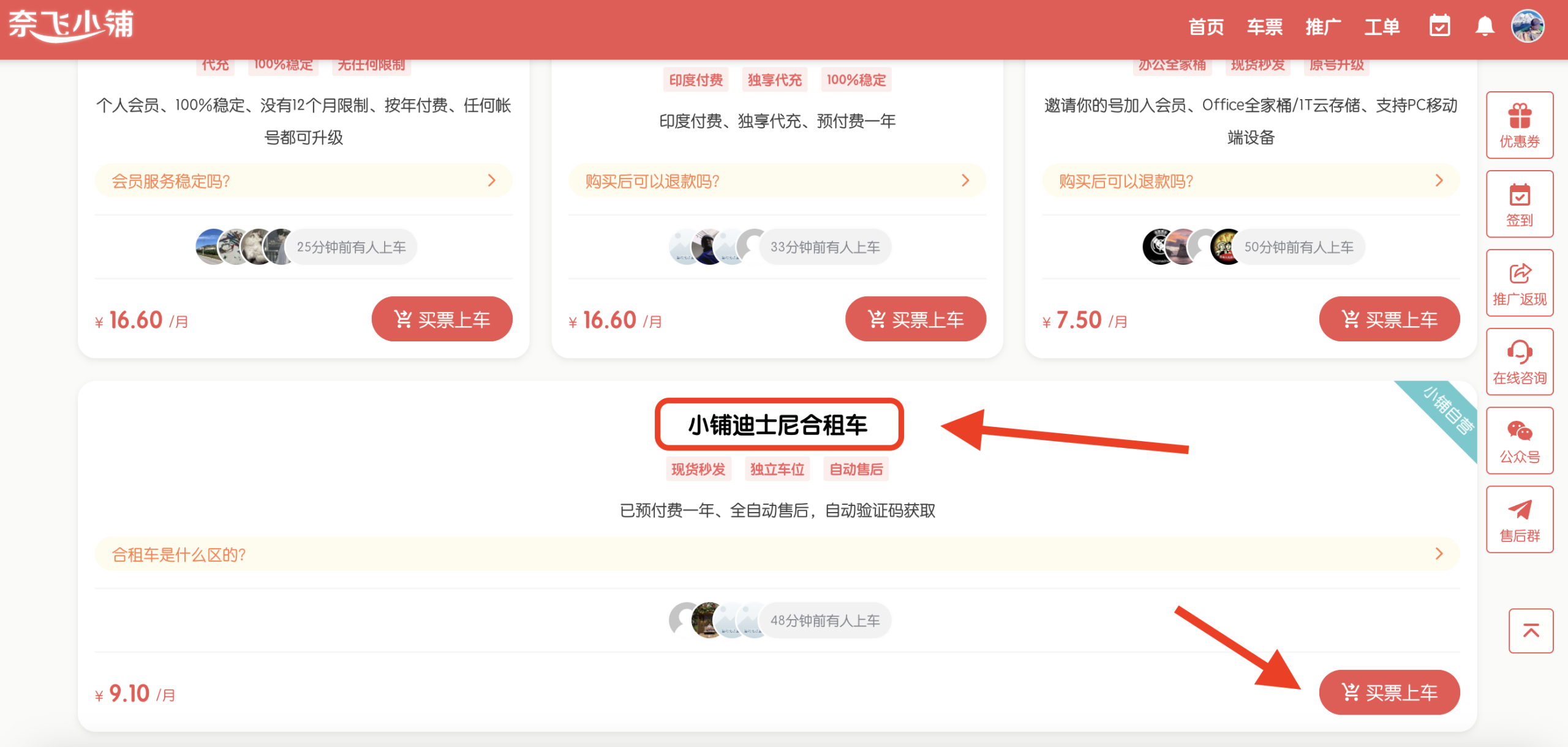 2、在奈飞小铺首页找到小铺迪士尼合租车,点击买票上车,如箭头所示。