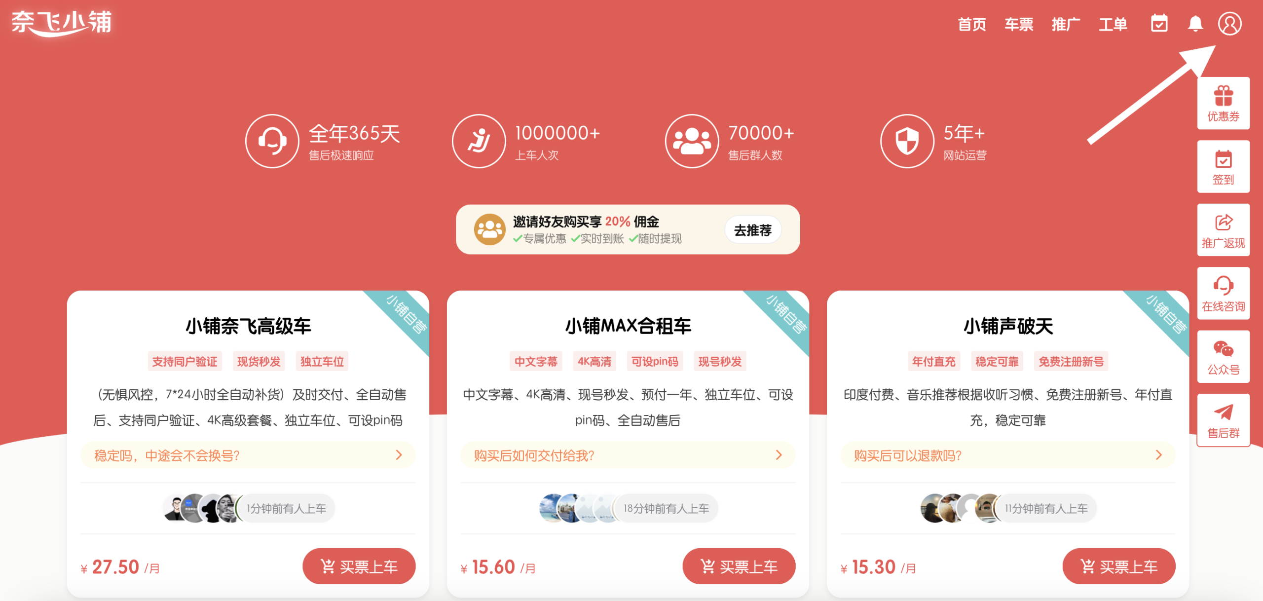 1、访问奈飞小铺官网,点击右上角头像,使用微信扫码或手机号快速注册登录。
