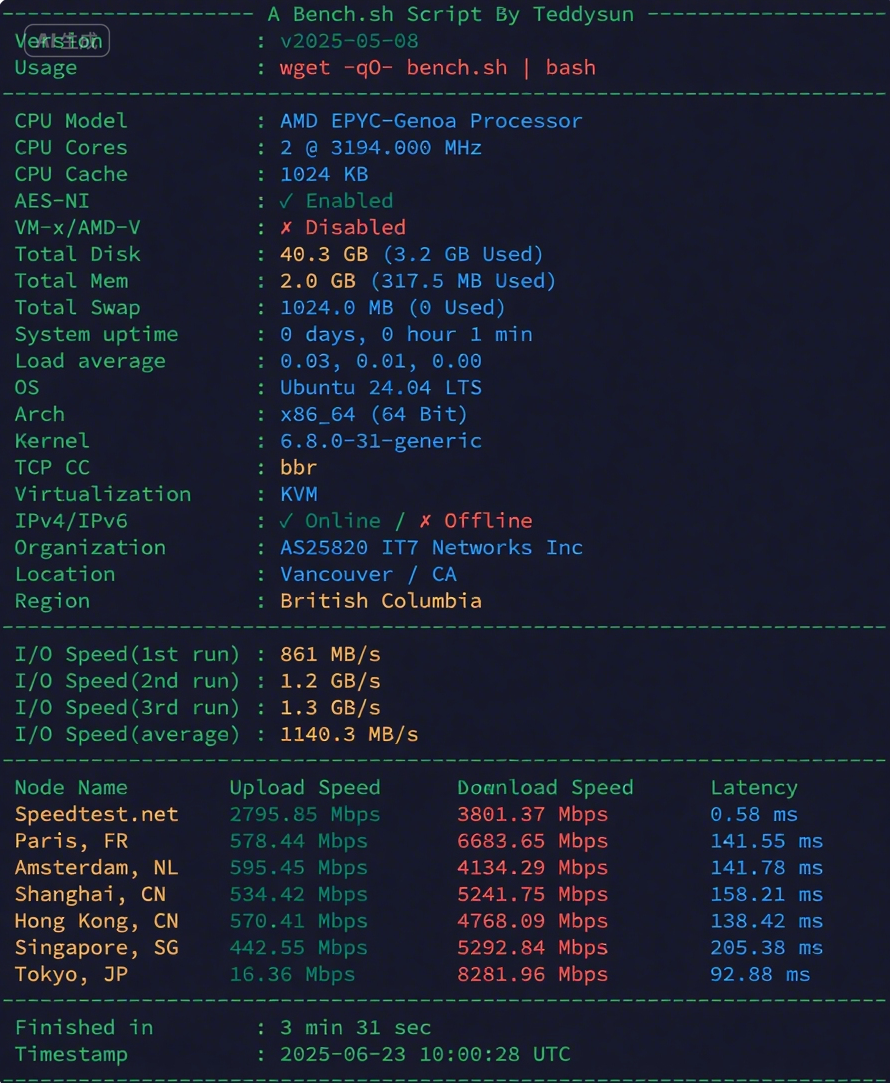 如下图所示,采用 bench.sh 脚本的测试结果。