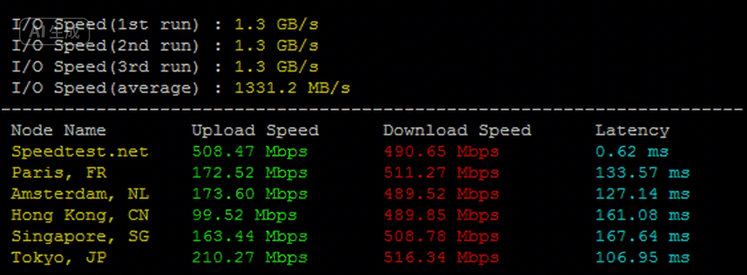 bench一键包测试结果,包括了磁盘IO和带宽情况。