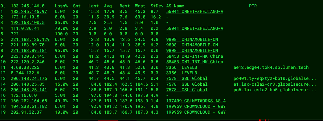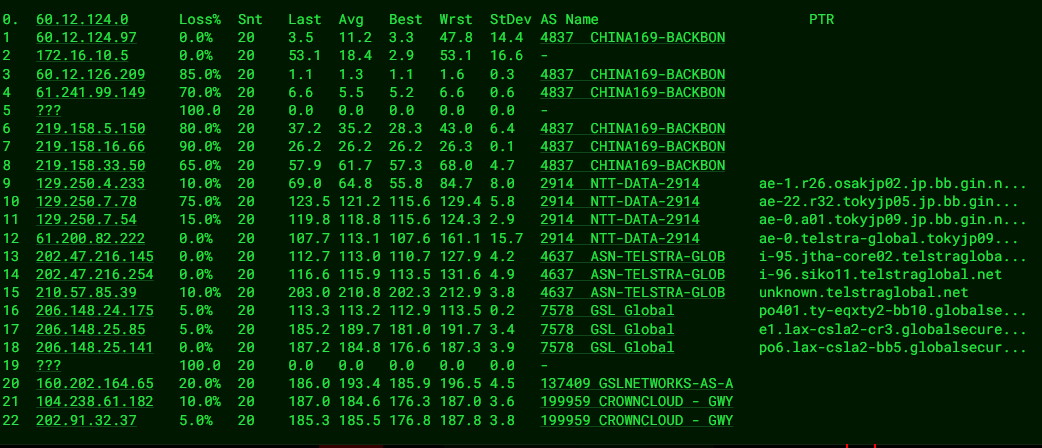 广州电信 58.60.188.222 0.19 ms AS199959 美国 加利福尼亚州 洛杉矶 GWY IT PTY LTD 0.24 ms AS199959 美国 加利福尼亚州 洛杉矶 QuadraNet 0.53 ms AS137409 美国 加利福尼亚 洛杉矶 globalsecurelayer.com 0.50 ms AS7578 美国 加利福尼亚 洛杉矶 globalsecurelayer.com 0.56 ms AS7578 美国 加利福尼亚 洛杉矶 globalsecurelayer.com 3.14 ms AS2914 美国 加利福尼亚 洛杉矶 gin.ntt.net 0.94 ms AS2914 [NTT-BACKBONE] 美国 加利福尼亚 洛杉矶 gin.ntt.net 15.36 ms AS4134 [CHINANET-US] 美国 加利福尼亚 圣克拉拉 www.chinatelecom.com.cn 电信 207.49 ms AS4134 [CHINANET-BB] 中国 广东 广州 www.chinatelecom.com.cn 159.87 ms AS4134 [CHINANET-BB] 中国 广东 广州 www.chinatelecom.com.cn 211.75 ms AS4134 [CHINANET-GD] 中国 广东 深圳 www.chinatelecom.com.cn 电信 164.01 ms AS4134 中国 广东 深圳 福田区 www.chinatelecom.com.cn 电信 ========================================================================================= 广州联通 210.21.196.6 0.19 ms AS199959 美国 加利福尼亚州 洛杉矶 GWY IT PTY LTD 0.45 ms AS199959 美国 加利福尼亚州 洛杉矶 QuadraNet 0.53 ms AS137409 美国 加利福尼亚 洛杉矶 globalsecurelayer.com 0.63 ms AS7578 美国 加利福尼亚 洛杉矶 globalsecurelayer.com 0.48 ms * RFC1918 0.60 ms AS6461 美国 加利福尼亚 洛杉矶 zayo.com 1.47 ms AS6461 美国 加利福尼亚 洛杉矶 zayo.com 162.17 ms AS6461 [ABOVENET-6] 美国 加利福尼亚 洛杉矶 zayo.com 206.99 ms AS4837 [CU169-BACKBONE] 中国 北京市 chinaunicom.cn 联通 206.78 ms AS4837 [CU169-BACKBONE] 中国 北京 chinaunicom.cn 联通 157.53 ms AS4837 [CU169-BACKBONE] 中国 北京 chinaunicom.cn 联通 190.98 ms AS17816 [APNIC-AP] 中国 广东省 广州市 chinaunicom.cn 197.90 ms AS17623 [APNIC-AP] 中国 广东 深圳 chinaunicom.cn 联通 189.85 ms AS17623 中国 广东 深圳 宝安区 chinaunicom.cn 联通 ========================================================================================= 广州移动 120.196.165.24 0.22 ms AS199959 美国 加利福尼亚州 洛杉矶 GWY IT PTY LTD 0.32 ms AS199959 美国 加利福尼亚州 洛杉矶 QuadraNet 0.52 ms AS137409 美国 加利福尼亚 洛杉矶 globalsecurelayer.com 0.64 ms AS7578 美国 加利福尼亚 洛杉矶 globalsecurelayer.com 0.41 ms * RFC1918 0.59 ms AS6461 美国 加利福尼亚 洛杉矶 zayo.com 1.18 ms AS6461 [ABOVENET-6] 美国 加利福尼亚 洛杉矶 zayo.com 1.09 ms AS58453 [CMI-INT] 美国 加利福尼亚 洛杉矶 cmi.chinamobile.com 移动 164.44 ms AS58453 [CMI-INT] 中国 广东 广州 cmi.chinamobile.com 移动 158.20 ms AS9808 [CMNET] 中国 广东 广州 X-I chinamobileltd.com 移动 166.45 ms AS9808 [CMNET] 中国 广东 广州 chinamobileltd.com 移动 166.47 ms AS9808 [CMNET] 中国 广东 广州 chinamobileltd.com 移动 165.36 ms AS56040 [APNIC-AP] 中国 广东 深圳 gd.10086.cn 移动