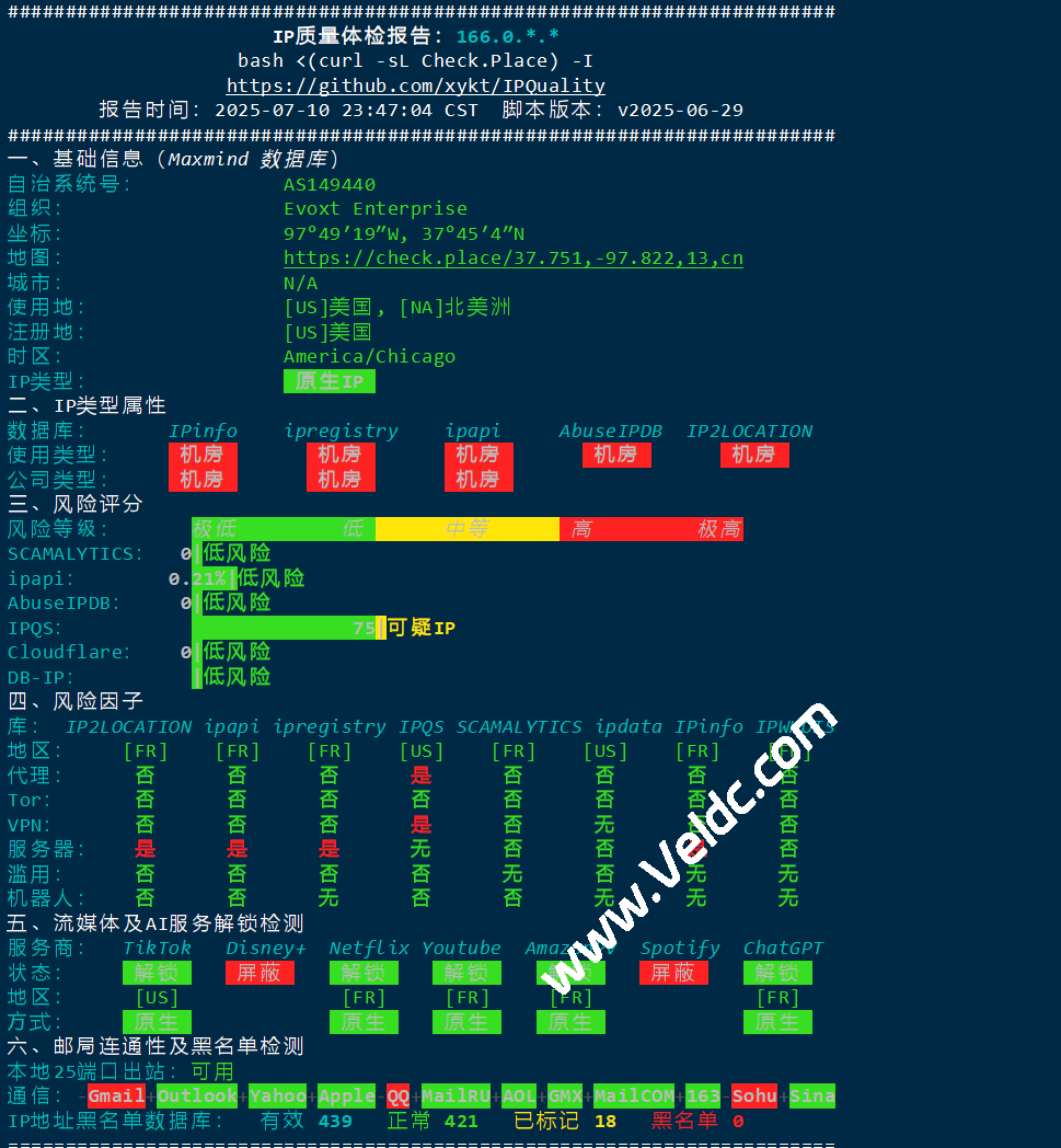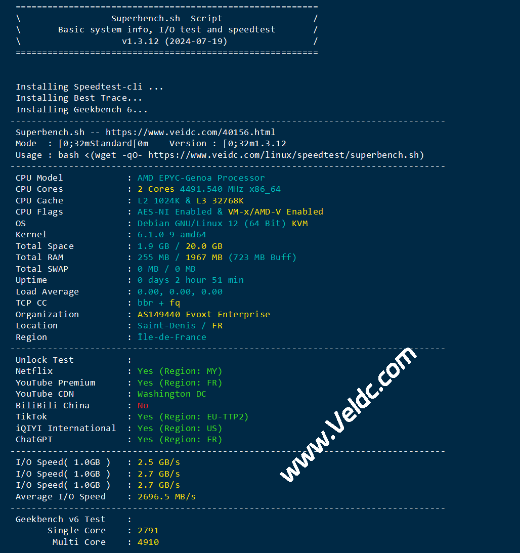 Evoxt在新增法国巴黎数据中心后现在机房已经达到16个,这也是继德国、英国、荷兰、波兰、瑞士苏黎世后的第六个欧洲机房,从PING.ME测试看并非直连线路,电信联通走的twelve99、移动COGENT,总体延迟尚可,机器采用AMD EPYC,硬盘IO高达2.5GB /s,性能不错,原生解锁Netflix、ChatGPT、Google Gemini等应用,支持美区Tiktok,VPS仍然基于KVM虚拟,1Gbps带宽,支持安装Linux或Windows系统,提供IPv4+IPv6,Weekly Backup,最低月付2.99美元起,支持使用支付宝、微信、PayPal、比特币、USDT等付款方式,下面是本次测评数据分享。