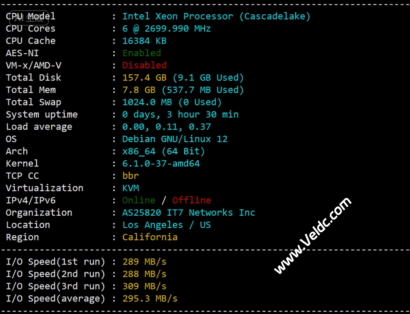 从测试结果看服务器CPU未知,主频2.7GHz,当前官方已经在升级服务器硬件的过程中,部分机房已经升级到AMD EPYC+NVMe SSD平台,其VPS底层为KVM虚拟,系统模板自动开启BBR,不支持IPv6(需要去后台自己动手开启才可以),搬瓦工自己的网络,归属地洛杉矶,当前测试I/O大致在295MB/S: