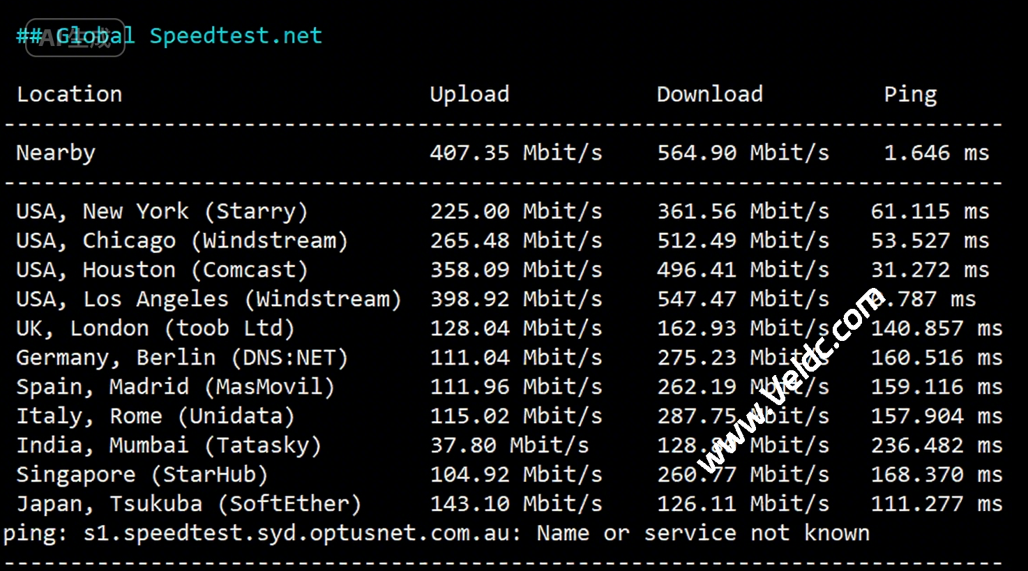 SpeedTest.Net的部分国际热门节点的带宽上下行测试数据:
