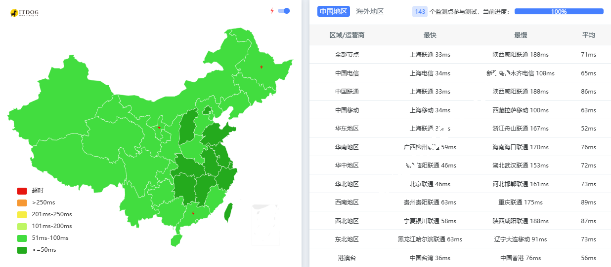下面是延迟测试结果,其实三网延迟都是很低的。