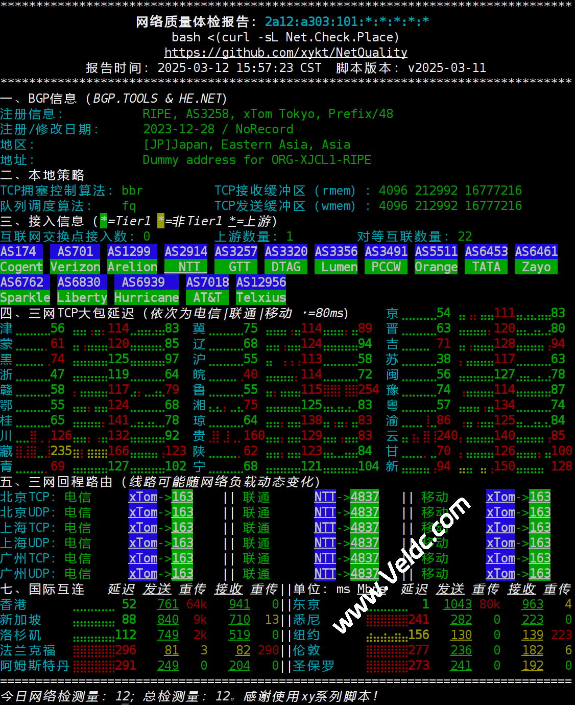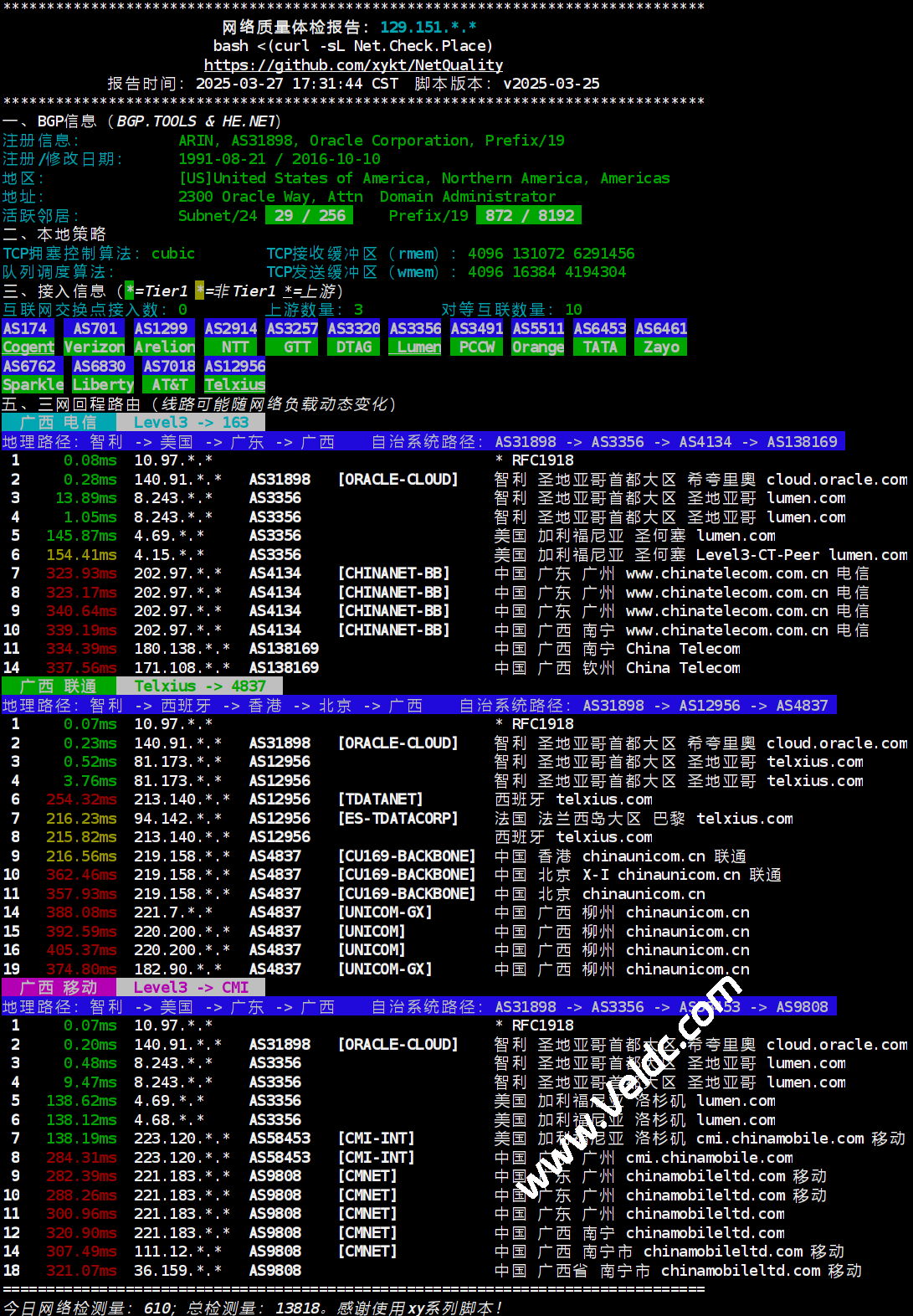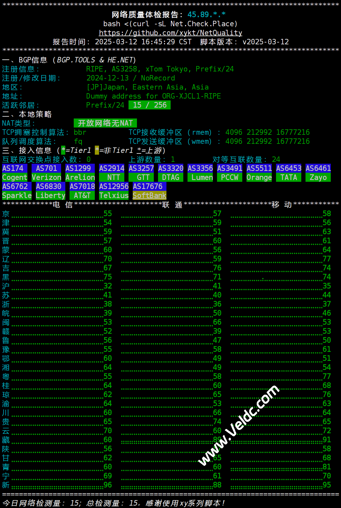 该脚本集成了多项实用功能,例如支持IPv4和IPv6双栈查询、提供BGP信息、三网延迟测试、回程路由分析以及国内外网速测试等。它的输出结果不仅内容详尽,还采用了精美的排版设计,方便用户截图分享或进行数据分析。