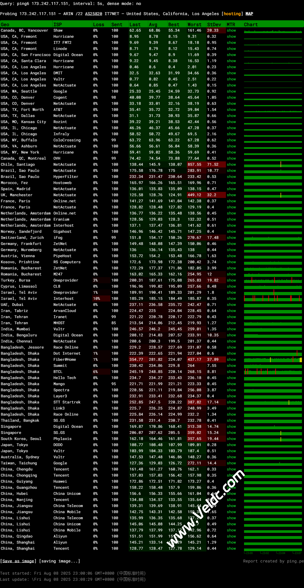 从ping.pe丢包测试图可以看出,DC6 机房的网络稳定性表现优异。国内电信、联通、移动三大运营商的丢包率测试均显示良好的网络质量,基本无明显丢包现象。这得益于 CN2 GIA 企业级专线的高品质保障,即使在网络高峰期也能维持稳定的连接质量,非常适合对网络稳定性要求较高的业务应用。