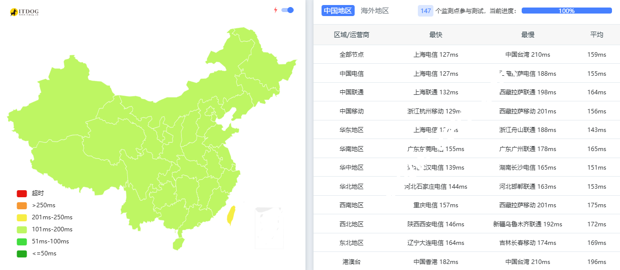 全球表现都非常好,国内电信、联通、移动三网的丢包率测试结果,如下图所示,可以看到三网全都是基本上 0 丢包,表现非常好。