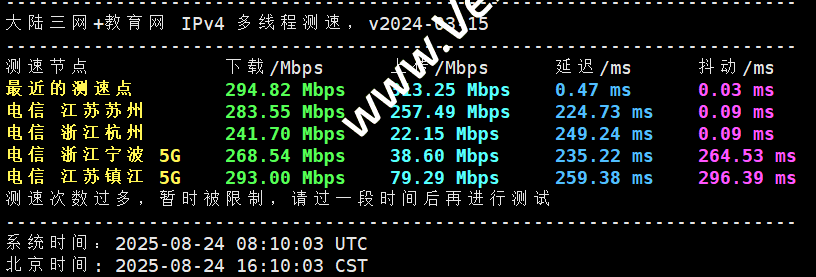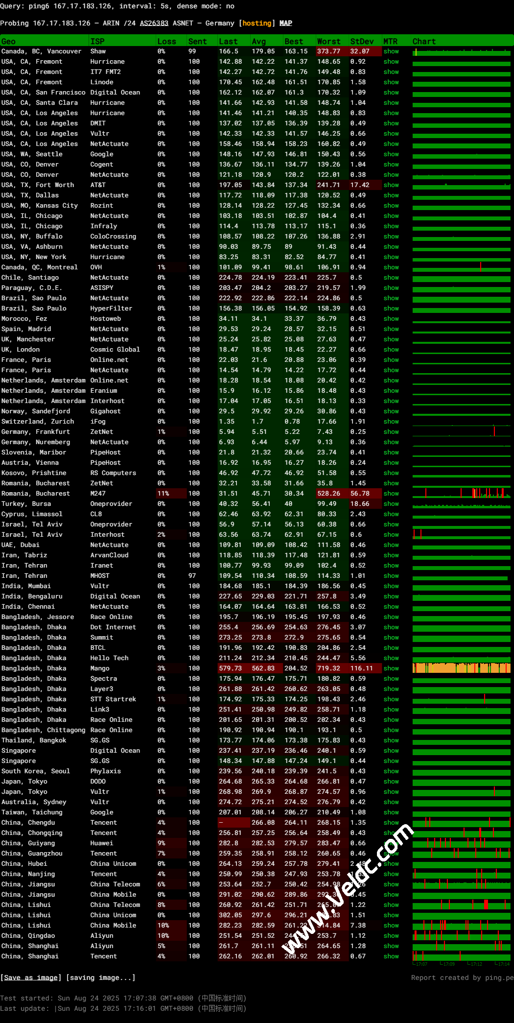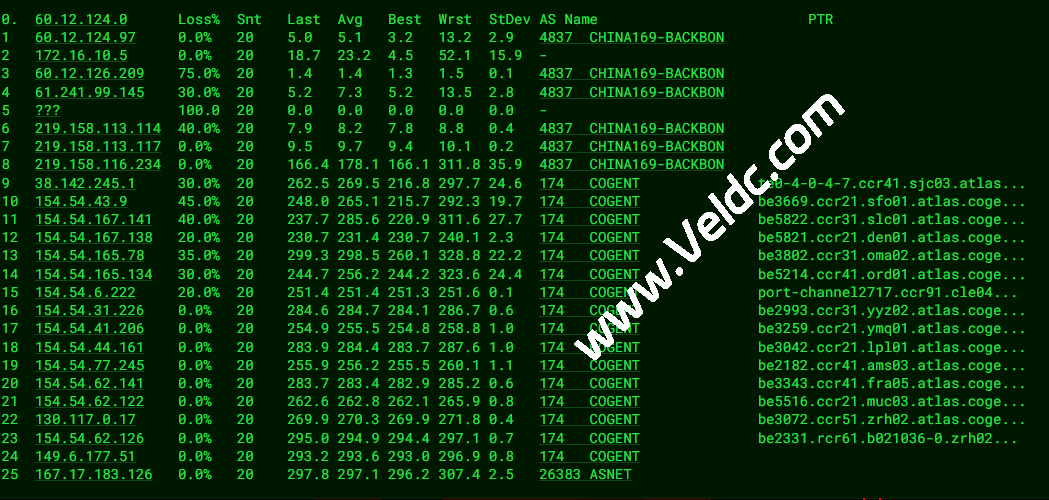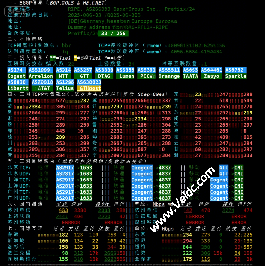 北京联通 NextTrace v1.4.2 2025-07-26T12:51:39Z cefed2a [NextTrace API] preferred API IP - 45.137.198.56 - 98.76ms - 🐠 (Relay) → Misaka.BER IP Geo Data Provider: LeoMoeAPI traceroute to 202.106.50.1, 30 hops max, 52 bytes payload, ICMP mode 1 167.17.181.1 AS26383 德国 瓦尔茨胡特田根 Baxet Group Inc. 0.28 ms / 0.60 ms / 0.30 ms 2 * 3 154.54.62.125 AS174 [COGENT-BONE] 瑞士 苏黎世 苏黎世 cogentco.com be2331.ccr51.zrh02.atlas.cogentco.com 1.04 ms / 0.99 ms / 1.08 ms 4 130.117.0.18 AS174 [COGENT-BONE] 德国 巴伐利亚 慕尼黑 cogentco.com be3072.ccr21.muc03.atlas.cogentco.com 6.14 ms / 6.11 ms / 6.19 ms 5 154.54.62.121 AS174 [COGENT-BONE] 德国 黑森 美因河畔法兰克福 cogentco.com be5516.ccr41.fra05.atlas.cogentco.com 58.16 ms / 11.63 ms / 11.66 ms 6 154.54.76.210 AS174 [COGENT-BONE] 德国 黑森 美因河畔法兰克福 cogentco.com be3763.agr31.fra05.atlas.cogentco.com 11.98 ms / 12.09 ms / 12.35 ms 7 149.11.228.213 AS174 [COGENT-149] 德国 黑森州 美因河畔法兰克福 cogentco.com 243.68 ms / 243.25 ms / 243.36 ms 8 * 9 219.158.9.61 AS4837 [CU169-BACKBONE] 中国 北京 chinaunicom.cn 220.05 ms / 270.42 ms / * ms 10 219.158.9.201 AS4837 [CU169-BACKBONE] 中国 北京 chinaunicom.cn 联通 270.65 ms / * ms / * ms 11 * 12 202.106.50.1 AS4808 [UNICOM-BJ] 中国 北京 丰台区 中国联通 联通 225.05 ms / 227.97 ms / 232.32 ms ---------------------------------------------------------------------- 上海联通 NextTrace v1.4.2 2025-07-26T12:51:39Z cefed2a [NextTrace API] preferred API IP - 45.137.198.56 - 98.52ms - 🐠 (Relay) → Misaka.BER IP Geo Data Provider: LeoMoeAPI traceroute to 210.22.97.1, 30 hops max, 52 bytes payload, ICMP mode 1 167.17.181.1 AS26383 德国 瓦尔茨胡特田根 Baxet Group Inc. 0.29 ms / 0.44 ms / 0.40 ms 2 * 3 154.54.63.73 AS174 [COGENT-BONE] 瑞士 苏黎世 苏黎世 cogentco.com be2332.ccr52.zrh02.atlas.cogentco.com 1.33 ms / 1.32 ms / 1.34 ms 4 130.117.0.62 AS174 [COGENT-BONE] 德国 巴伐利亚 慕尼黑 cogentco.com be3073.ccr22.muc03.atlas.cogentco.com 6.65 ms / 6.66 ms / 6.65 ms 5 154.54.75.98 AS174 [COGENT-BONE] 德国 黑森 美因河畔法兰克福 cogentco.com be7944.ccr42.fra05.atlas.cogentco.com 12.21 ms / 12.50 ms / 12.35 ms 6 154.54.38.113 AS174 [COGENT-BONE] 德国 黑森 美因河畔法兰克福 cogentco.com be8232.rcr31.fra06.atlas.cogentco.com 12.39 ms / 12.26 ms / 12.27 ms 7 149.11.21.241 AS174 [COGENT-149] 德国 黑森州 美因河畔法兰克福 cogentco.com 250.45 ms / 250.55 ms / 250.46 ms 8 219.158.14.189 AS4837 [CU169-BACKBONE] 中国 广东 广州 chinaunicom.cn 联通 270.65 ms / 273.75 ms / 275.01 ms 9 219.158.20.221 AS4837 [CU169-BACKBONE] 中国 广东 广州 X-I chinaunicom.cn 联通 243.00 ms / 243.13 ms / 238.57 ms 10 * 11 * 12 * 13 112.64.250.202 AS17621 [APNIC-AP] 中国 上海 chinaunicom.cn 联通 240.75 ms / 242.76 ms / 246.78 ms 14 210.22.97.1 AS17621 [CNCNET-SH] 中国 上海 闵行区 chinaunicom.cn 联通 245.92 ms / 245.64 ms / 244.78 ms ---------------------------------------------------------------------- 深圳联通 NextTrace v1.4.2 2025-07-26T12:51:39Z cefed2a [NextTrace API] preferred API IP - 45.137.198.56 - 99.00ms - 🐠 (Relay) → Misaka.BER IP Geo Data Provider: LeoMoeAPI traceroute to 210.21.196.6, 30 hops max, 52 bytes payload, ICMP mode 1 167.17.181.1 AS26383 德国 瓦尔茨胡特田根 Baxet Group Inc. 0.44 ms / 0.48 ms / 0.34 ms 2 * 3 154.54.63.73 AS174 [COGENT-BONE] 瑞士 苏黎世 苏黎世 cogentco.com be2332.ccr52.zrh02.atlas.cogentco.com 1.36 ms / 1.41 ms / 1.51 ms 4 130.117.0.62 AS174 [COGENT-BONE] 德国 巴伐利亚 慕尼黑 cogentco.com be3073.ccr22.muc03.atlas.cogentco.com 6.71 ms / 6.76 ms / 6.46 ms 5 154.54.75.98 AS174 [COGENT-BONE] 德国 黑森 美因河畔法兰克福 cogentco.com be7944.ccr42.fra05.atlas.cogentco.com 11.87 ms / 11.97 ms / 12.03 ms 6 154.54.38.113 AS174 [COGENT-BONE] 德国 黑森 美因河畔法兰克福 cogentco.com be8232.rcr31.fra06.atlas.cogentco.com 12.59 ms / 12.33 ms / 12.38 ms 7 149.11.21.241 AS174 [COGENT-149] 德国 黑森州 美因河畔法兰克福 cogentco.com 250.38 ms / 252.59 ms / 253.09 ms 8 219.158.19.209 AS4837 [CU169-BACKBONE] 中国 广东 广州 chinaunicom.cn 联通 255.83 ms / 256.39 ms / 256.59 ms 9 219.158.4.13 AS4837 [CU169-BACKBONE] 中国 广东 广州 chinaunicom.cn 联通 238.24 ms / 236.12 ms / 234.07 ms 10 * 11 120.86.0.46 AS17816 [APNIC-AP] 中国 广东省 深圳市 chinaunicom.cn 联通 325.59 ms / * ms / * ms 12 120.80.144.34 AS17623 [APNIC-AP] 中国 广东 深圳 chinaunicom.cn 联通 282.34 ms / 277.38 ms / 274.34 ms 13 210.21.196.6 AS17623 中国 广东 深圳 宝安区 chinaunicom.cn 联通 235.90 ms / 235.85 ms / 235.90 ms