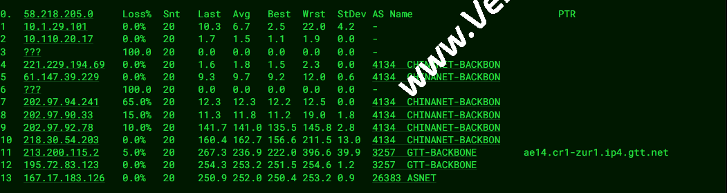 北京电信 NextTrace v1.4.2 2025-07-26T12:51:39Z cefed2a [NextTrace API] preferred API IP - 45.137.198.56 - 163.18ms - 🐠 (Relay) → Misaka.BER IP Geo Data Provider: LeoMoeAPI traceroute to 219.141.147.210, 30 hops max, 52 bytes payload, ICMP mode 1 167.17.181.1 AS26383 德国 瓦尔茨胡特田根 Baxet Group Inc. 0.34 ms / 0.42 ms / 0.33 ms 2 100.73.5.254 * RFC6598 1.08 ms / 1.68 ms / 0.94 ms 3 100.73.115.1 * RFC6598 19.59 ms / 17.10 ms / 5.15 ms 4 62.140.255.110 AS28917 德国 黑森 美因河畔法兰克福 fiord.net fra-nt-b1-ae1-vlan1003.fiord.net 6.41 ms / 5.82 ms / 5.86 ms 5 80.81.195.33 AS4134 [DE-CIX] 德国 黑森 美因河畔法兰克福 DE-CIX Frankfurt - China Telecom - 100Gbps www.chinatelecom.com.cn ancotel.GM-FF-FRK-F-2.163.chinatelecomeurope.com 7.59 ms / 7.28 ms / 6.55 ms 6 * 7 202.97.12.53 AS4134 [CHINANET-BB] 中国 北京 www.chinatelecom.com.cn 电信 220.66 ms / 220.52 ms / 220.48 ms 8 202.97.34.73 AS4134 [CHINANET-BB] 中国 北京 www.chinatelecom.com.cn 电信 222.31 ms / 222.58 ms / * ms 9 * 10 * 11 106.120.254.6 AS4847 [CHINANET-GD] 中国 北京 chinatelecom.cn 222.31 ms / 222.78 ms / 222.89 ms 12 219.141.147.210 AS4847 [CHINATELECOM-BJ] 中国 北京 chinatelecom.cn 223.23 ms / 223.11 ms / 223.38 ms ---------------------------------------------------------------------- 上海电信 NextTrace v1.4.2 2025-07-26T12:51:39Z cefed2a [NextTrace API] preferred API IP - [2a0b:64c0:1::2ba] - 99.09ms - 🐠 (Relay) → Misaka.BER IP Geo Data Provider: LeoMoeAPI traceroute to 202.96.209.133, 30 hops max, 52 bytes payload, ICMP mode 1 167.17.181.1 AS26383 德国 瓦尔茨胡特田根 Baxet Group Inc. 0.30 ms / 0.79 ms / 0.55 ms 2 100.73.5.254 * RFC6598 1.01 ms / 0.89 ms / 0.98 ms 3 100.73.115.1 * RFC6598 13.33 ms / 15.78 ms / 6.00 ms 4 62.140.255.110 AS28917 德国 黑森 美因河畔法兰克福 fiord.net fra-nt-b1-ae1-vlan1003.fiord.net 5.26 ms / 12.33 ms / 7.41 ms 5 80.81.195.33 AS4134 [DE-CIX] 德国 黑森 美因河畔法兰克福 DE-CIX Frankfurt - China Telecom - 100Gbps www.chinatelecom.com.cn ancotel.GM-FF-FRK-F-2.163.chinatelecomeurope.com 6.59 ms / 6.51 ms / 8.04 ms 6 202.97.70.33 AS4134 [CHINANET-BB] 中国 上海 www.chinatelecom.com.cn 电信 239.43 ms / 239.46 ms / 239.50 ms 7 202.97.35.85 AS4134 [CHINANET-BB] 中国 上海 www.chinatelecom.com.cn 电信 300.84 ms / 302.35 ms / * ms 8 * 9 * 10 180.169.255.122 AS4812 [CHINANET-SH] 中国 上海 chinatelecom.cn 电信 263.59 ms / 322.57 ms / * ms 11 202.96.209.133 AS4812 [CHINANET-SH] 中国 上海 chinatelecom.cn 电信 262.62 ms / 262.42 ms / 262.41 ms ---------------------------------------------------------------------- 深圳电信 NextTrace v1.4.2 2025-07-26T12:51:39Z cefed2a [NextTrace API] preferred API IP - 45.137.198.56 - 100.85ms - 🐠 (Relay) → Misaka.BER IP Geo Data Provider: LeoMoeAPI traceroute to 58.60.188.222, 30 hops max, 52 bytes payload, ICMP mode 1 167.17.181.1 AS26383 德国 瓦尔茨胡特田根 Baxet Group Inc. 0.53 ms / 0.53 ms / 0.36 ms 2 100.73.5.254 * RFC6598 8.65 ms / 0.90 ms / 0.87 ms 3 100.73.115.1 * RFC6598 5.48 ms / 5.56 ms / 13.73 ms 4 62.140.255.110 AS28917 德国 黑森 美因河畔法兰克福 fiord.net fra-nt-b1-ae1-vlan1003.fiord.net 13.44 ms / 11.95 ms / 11.18 ms 5 80.81.195.33 AS4134 [DE-CIX] 德国 黑森 美因河畔法兰克福 DE-CIX Frankfurt - China Telecom - 100Gbps www.chinatelecom.com.cn ancotel.GM-FF-FRK-F-2.163.chinatelecomeurope.com 6.89 ms / 8.16 ms / 7.79 ms 6 202.97.70.38 AS4134 [CHINANET-BB] 中国 广东 广州 www.chinatelecom.com.cn 电信 247.53 ms / 247.47 ms / 247.71 ms 7 202.97.12.22 AS4134 [CHINANET-BB] 中国 广东 广州 www.chinatelecom.com.cn 电信 241.07 ms / 241.02 ms / 241.06 ms 8 * 9 14.147.127.66 AS134774 [CHINANET-GD] 中国 广东 深圳 chinatelecom.cn 电信 262.06 ms / 261.95 ms / 262.09 ms 10 * 11 * 12 * 13 * 14 * 15 * 16 * 17 * 18 * 19 * 20 * 21 * 22 * 23 * 24 * 25 * 26 * 27 * 28 * 29 * 30 *