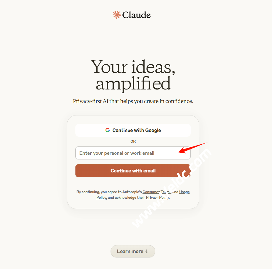 首先访问Claude官网:https://claude.ai,可以选择谷歌账号注册或者邮箱注册,这里我们选择邮箱注册。