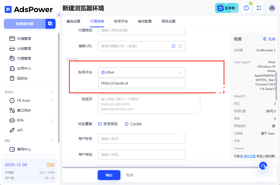 如果是使用AdsPower进行注冊,在配置环境时在账号平台一栏输入Claude官网地址,这样启动浏览器环境就会自动打开界面。