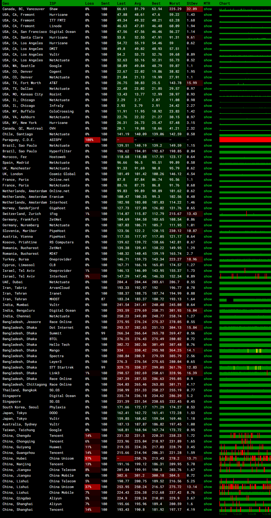 | 20 | 154.54.81.65 | 美国伊利诺伊州芝加哥 cogentco.com | AS174 | 673.3 / 702 / 737.1 |