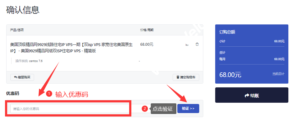 步骤一、选择好机房配置后(点击直达官网)在丽萨主机订单确认页面,可以看到一个“优惠码”输入框,在此输入优惠码即可,如下图所示: