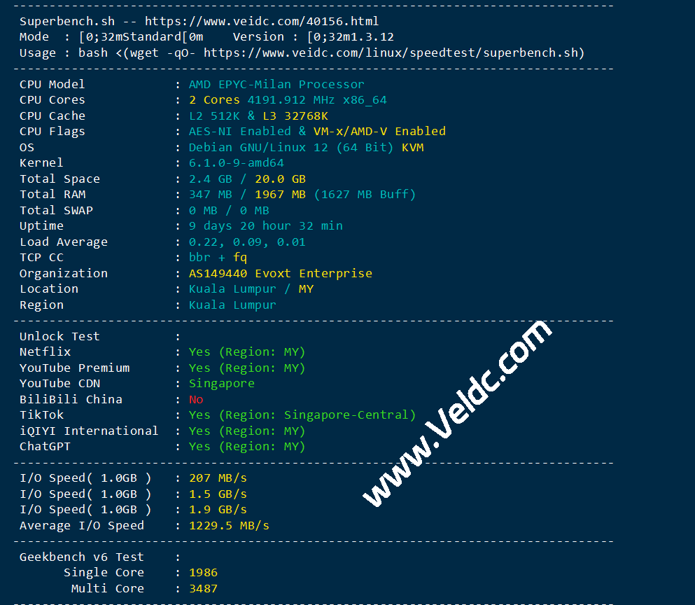 在当前的云计算市场中,一台 VPS 想要脱颖而出,仅仅拥有高带宽是不够的。它必须具备优秀的地理连通性、纯净的 IP 质量以及强大的流媒体解锁能力。我们最近对一台位于马来西亚吉隆坡 (Kuala Lumpur),运营商为 Evox Enterprise (AS149440) 的 VPS 进行了全面测试。结果显示,它不仅在硬件上配置豪华,更在亚洲网络和流媒体解锁方面交出了令人惊艳的答卷。尤其是中国电信 (CT) 延迟极低,这得益于采用了优化的CN2网络,简直就是中国电信用户的福音,至于移动和联通延迟较高。下面是本次测评详情。