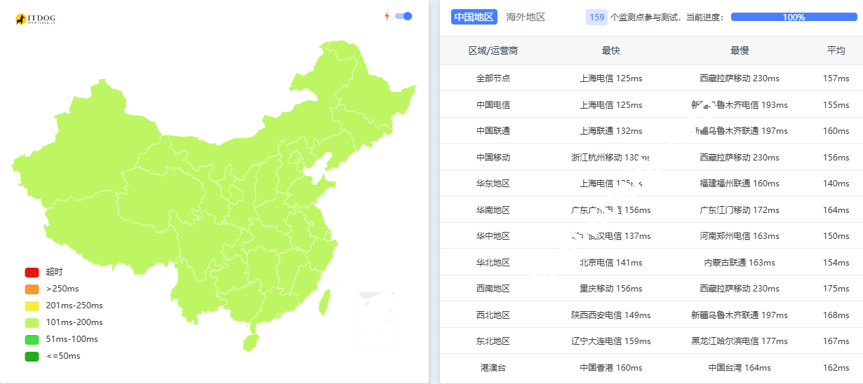 从全国延迟热力图来看,地图几乎全绿(代表延迟 < 200ms),没有出现任何代表超时的红色区域,也没有代表严重卡顿的橙色区域。这说明 DC5 SLA 机房在国内的覆盖质量极高,无论是沿海发达地区还是西北内陆,都能保持稳定的连接。