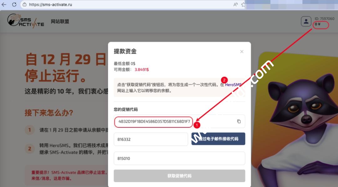运营超过 10 年的接码平台 SMS-Activate,近期终于开放了 旧余额无门槛转移 功能。虽然官方并未通过邮件通知,且官网目前存在部分页面跳转异常(404 Bug),但经过实测,余额确实可以成功找回。