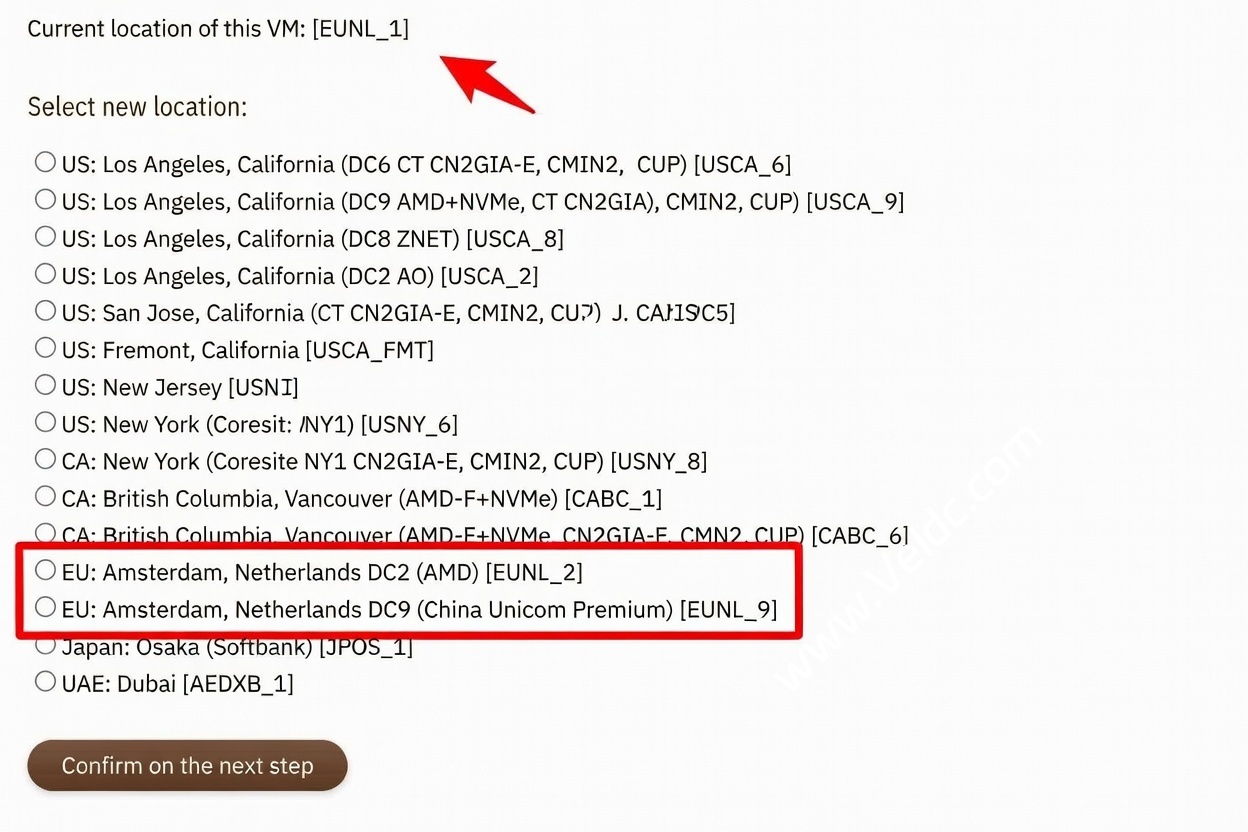 - 必须购买的时候就选择 EUNL_1,如果选择其他机房,购买后是无法迁入 EUNL_1 的!